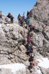 Cand treci prin Garmisch este musai sa urci pe varful Zugspitze (Varful Trenului), „Top of Germany” – cum ii spun nemtii. Unii dintre voi, mai cu forta in picioare si cu experienta de alpinisti, se pot incumeta sa faca acest drum la picior. Sunt trasee marcate si, pentru un alpinist cu experienta, cred ca nu este deloc greu. Noi, ceilalti, mai cu lenea in picioare, mai cu cateva kilograme (zeci) in plus, mai cu copilasii dupa noi, ne putem folosi cu mare succes de Zugspitzbahn-ul pus la dispozitie de autoritatile locale. Nu este o calatorie ieftina, pentru o familie de 3 persoane (parintii plus un copil) costul acesteia ajungand la 103 Euro. In pret este inclus drumul dus-intors cu trenul si cu telecabinele. Adica, plecam frumos cu trenul din Garmisch, mergem cateva statii (parca vreo 4), apoi il schimbam cu unul pe cremaliera care poate urca pante abrupte si care ne va duce pana la 2600 de metri. O parte a drumului se va face printr-un tunel lung de aproape 4 Km. Remarc ca drumul cu ambele trenuri dureaza mai bine de 1 ora.
