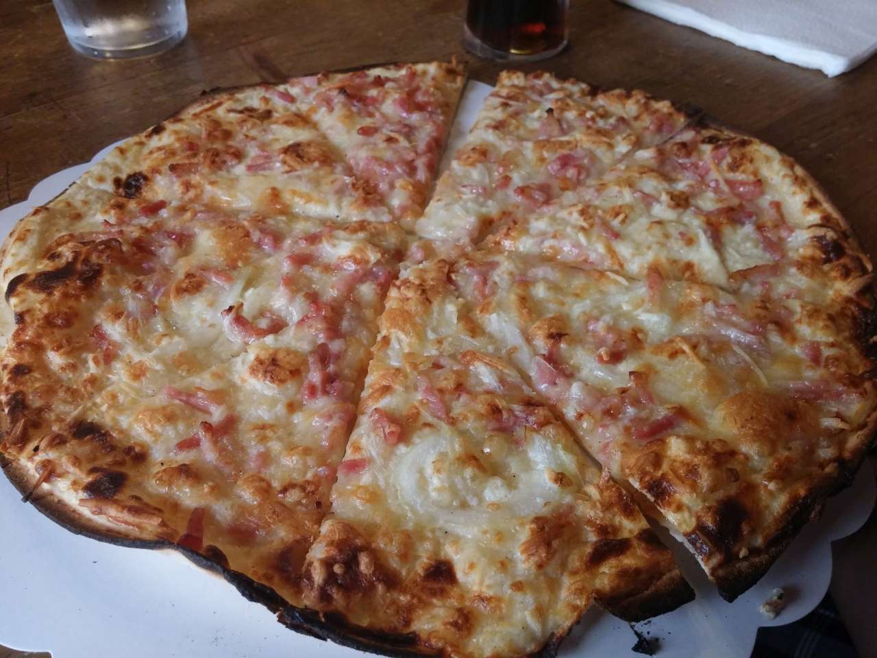 La un moment dat a inceput ploaia, asa ca am hotarat sa ne retragem intr-un barulet. Unde am mancat o foarte buna „Tarte flambée„, un produs traditional alsacian, un fel de pizza cu blat subtire, smantana, ceapa si sunca. Normal, am stins-o cu o bere alsaciana.