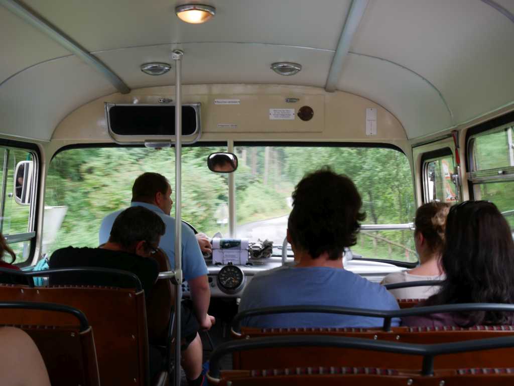 Noroc cu doi cetățeni de acolo, care păzeau intrarea către Castel și care ne-au explicat că putem aștepta autobuzul care duce vizitatorii sus. Și după 5 minute de așteptare, acesta (autobuzul) și-a făcut apariția. Un autobuz de prin anii 50, un Saurer în stare perfectă de funcționare. Care ne-a dus fără probleme pe drumul strâmt și cu multe viraje către castel.