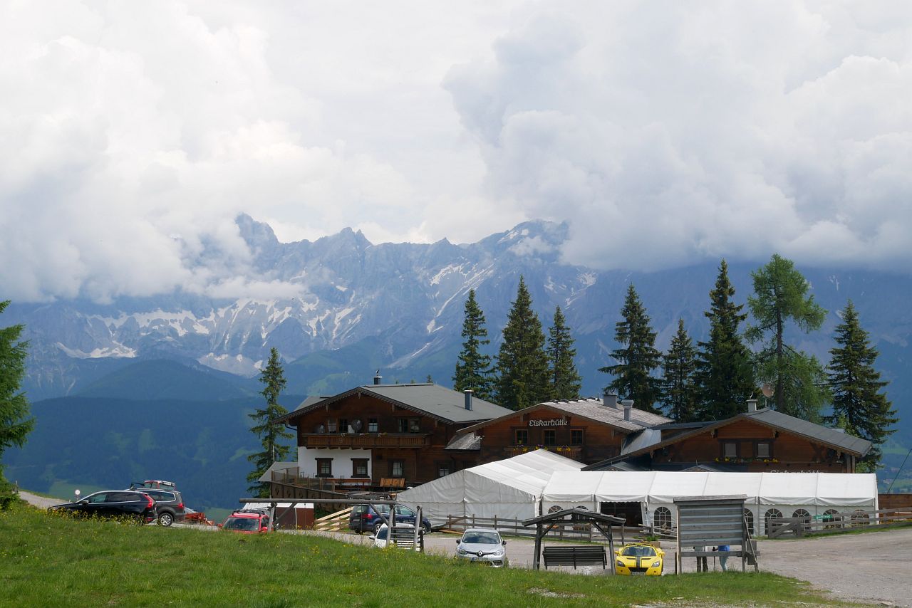 După vreo 20 de kilometri pe șosea și încă vreo 10 kilometri pe drumul privat cu taxă, care avea și zone de macadam (unul foarte bine tasat, fără gropi sau denivelări), am parcat lângă cabana Eiskarhutte. Drumul mergea chiar un pic mai sus, către cabana Reiteralm. Dar 10 minute de mers pe jos în plus nu ne-au deranjat, doar de aia ne aflam acolo.