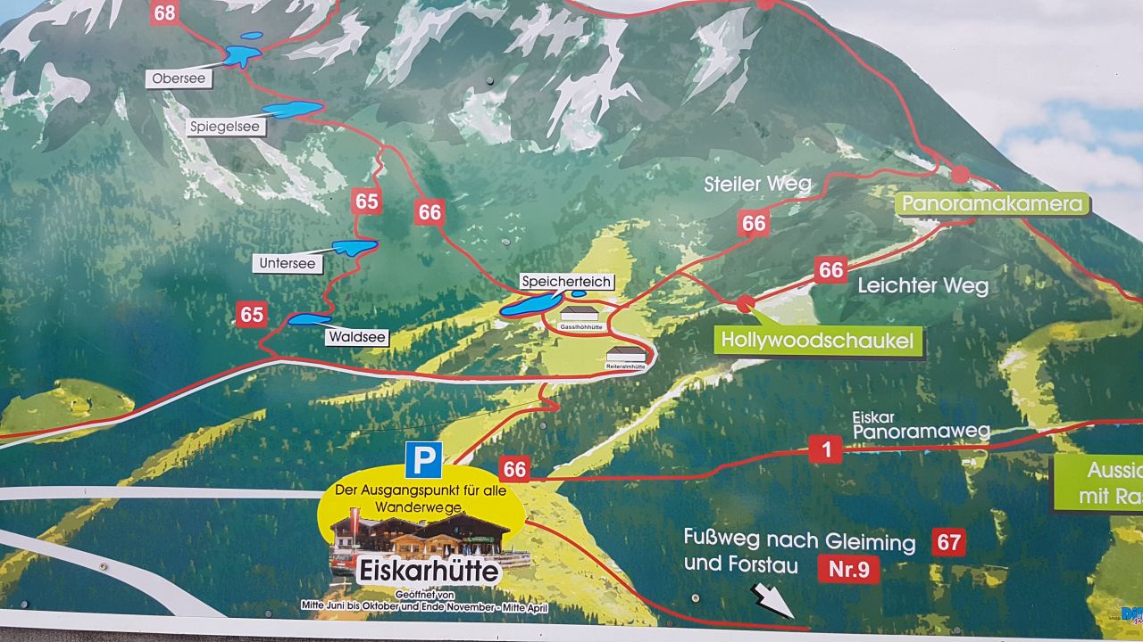 Acolo am avut la dispoziție un panou pe care am consultat traseul care trebuia urmat către Spiegelsee – lacul oglindă. Scria ceva de 45 de minute dar ne-am gândit că o să depășim cam cu jumătate de oră timpul în care vom ajunge acolo (și cam așa a și fost). Un total de 3-4 ore dus-întors era ceea ce ne propusesem, ca să nu ne prindă cumva vreo ploaie de după-amiază pe munte. Și care nu ne-a ocolit când ne întorceam la mașină.