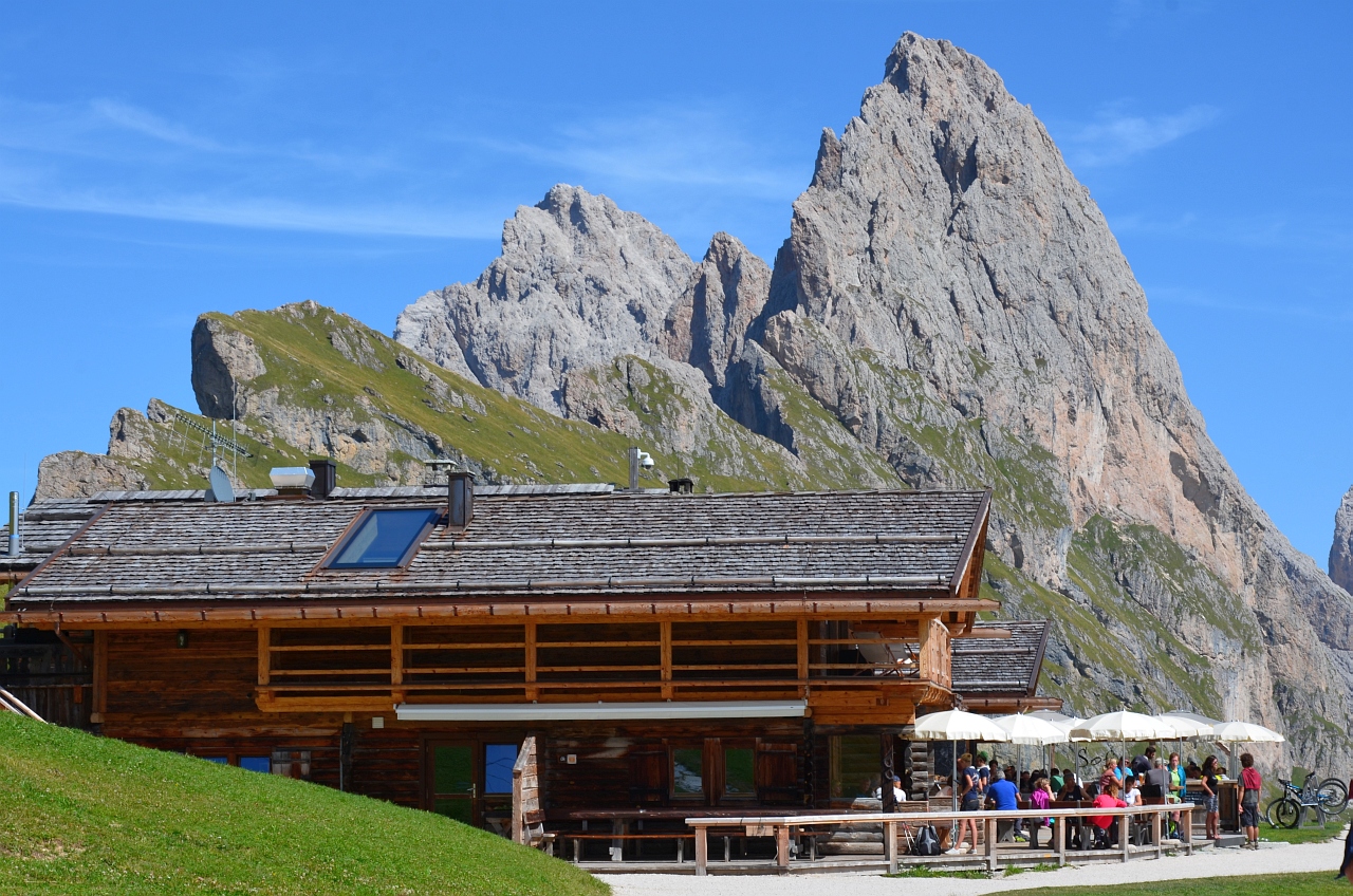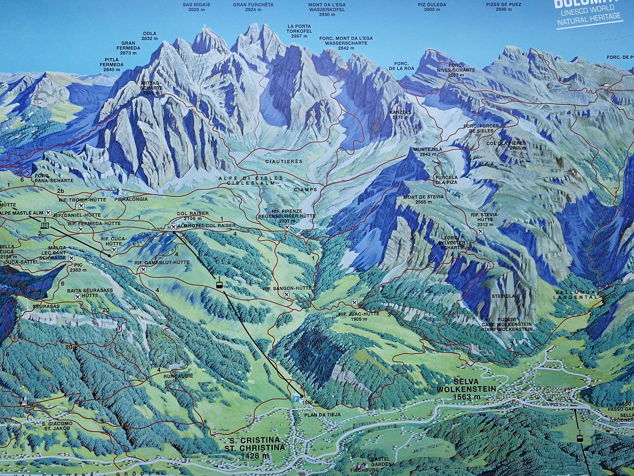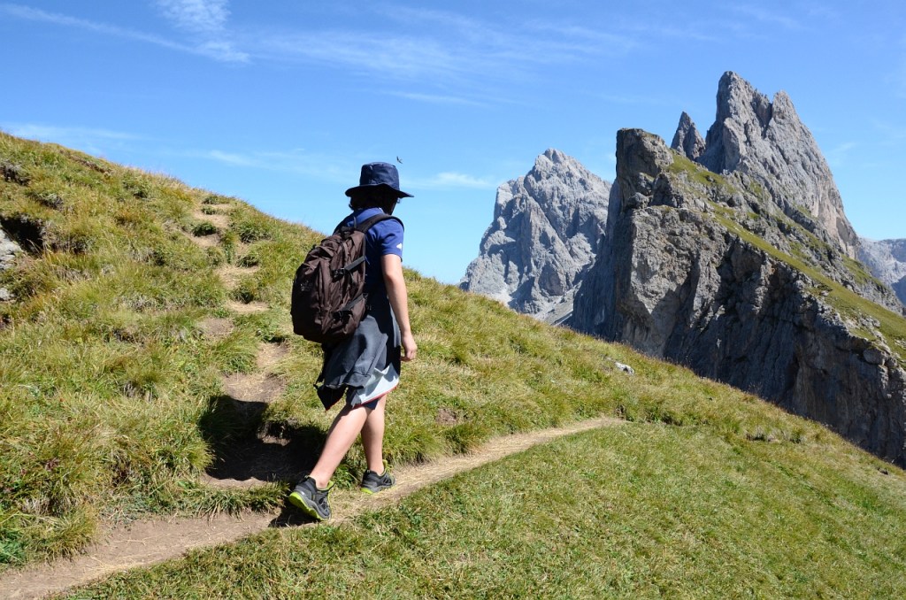 O zi senină, încă de dimineață. Așa că am mers până în Santa Cristina și am luat gondola către Col Raiser (2107m). Pentru toți trei (mamă, tată și copil), dus-întors, a costat 51 de Euro. Iar parcarea mașinii 3.5 Euro/zi.