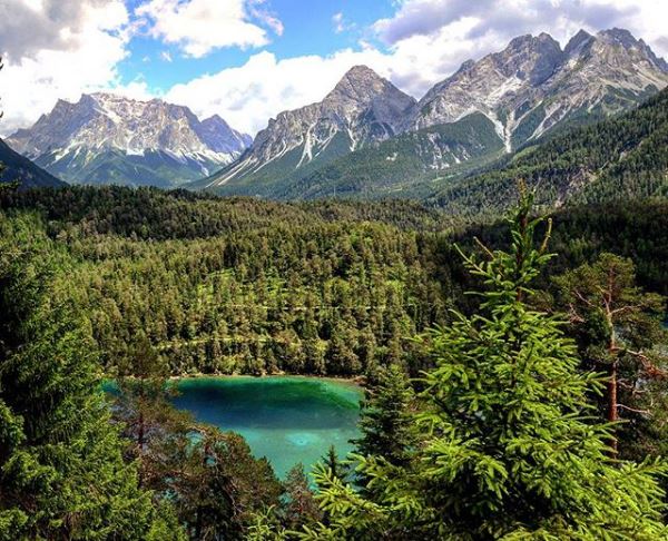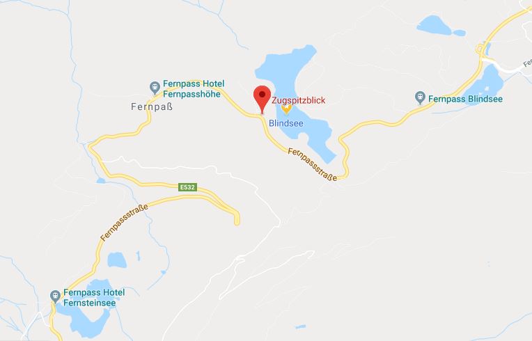 Dacă sunteți cu mașina prin pasul Fern din Tirol/Austria, atunci faceți neapărat o oprire la Zugspitzblick, măcar pentru câteva minute. Este unul dintre locurile în care veți putea vedea o panoramă superbă asupra muntelui Zugspitze și a lacului Blindsee.