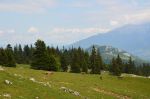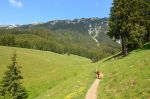 După care am ajuns într-o poiană mare, în care aveam la vedere creasta nordică a munților Piatra Craiului. Frumos, tare frumos acolo. L-am pozat și pe cățelușul care ne-a însoțit din prăpăstii și până sus la Cabana Curmătura. Era mai în formă decât noi, asta e clar.