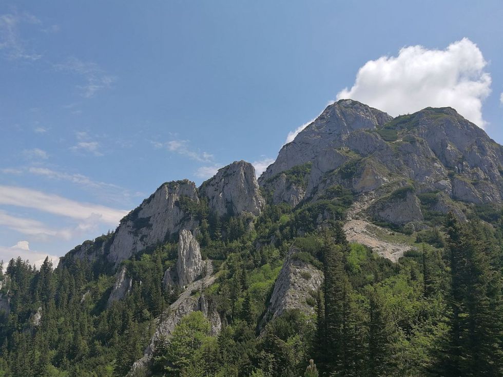 Acolo la punctul de belvedere am văzut vârful Piatra Mică, spre care ne îndreptam. Începea urcușul pe stânci, printre firide, prin zonele cu lanțuri, vreo trei la număr… frumoasă urcare. Iar vremea ținea cu noi, cel puțin pentru încă vreo oră, pentru că norii începeau deja să se adune…