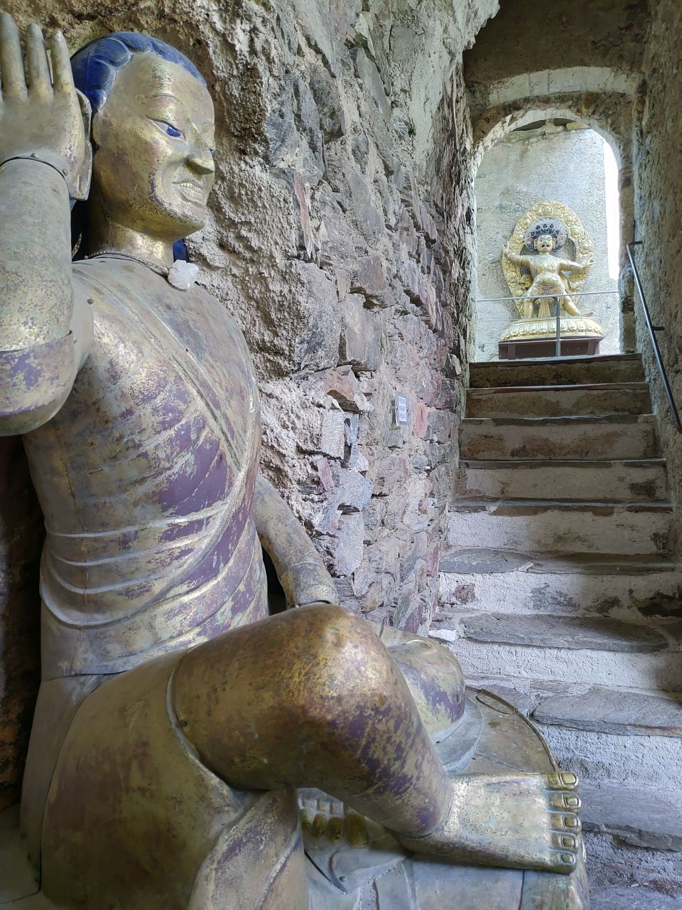 Apoi am vizitat impresionanta bibliotecă a lui Messner, în centrul căreia era expusă o imensă hartă a Tirolului, realizată de un cartograf prin anii 1700. Apoi a urmat camera măștilor, cu exponate de pe cinci continente. Tot acolo am văzut și o statuie a lui Padma Sambhava, fondatorul budismului tibetan.