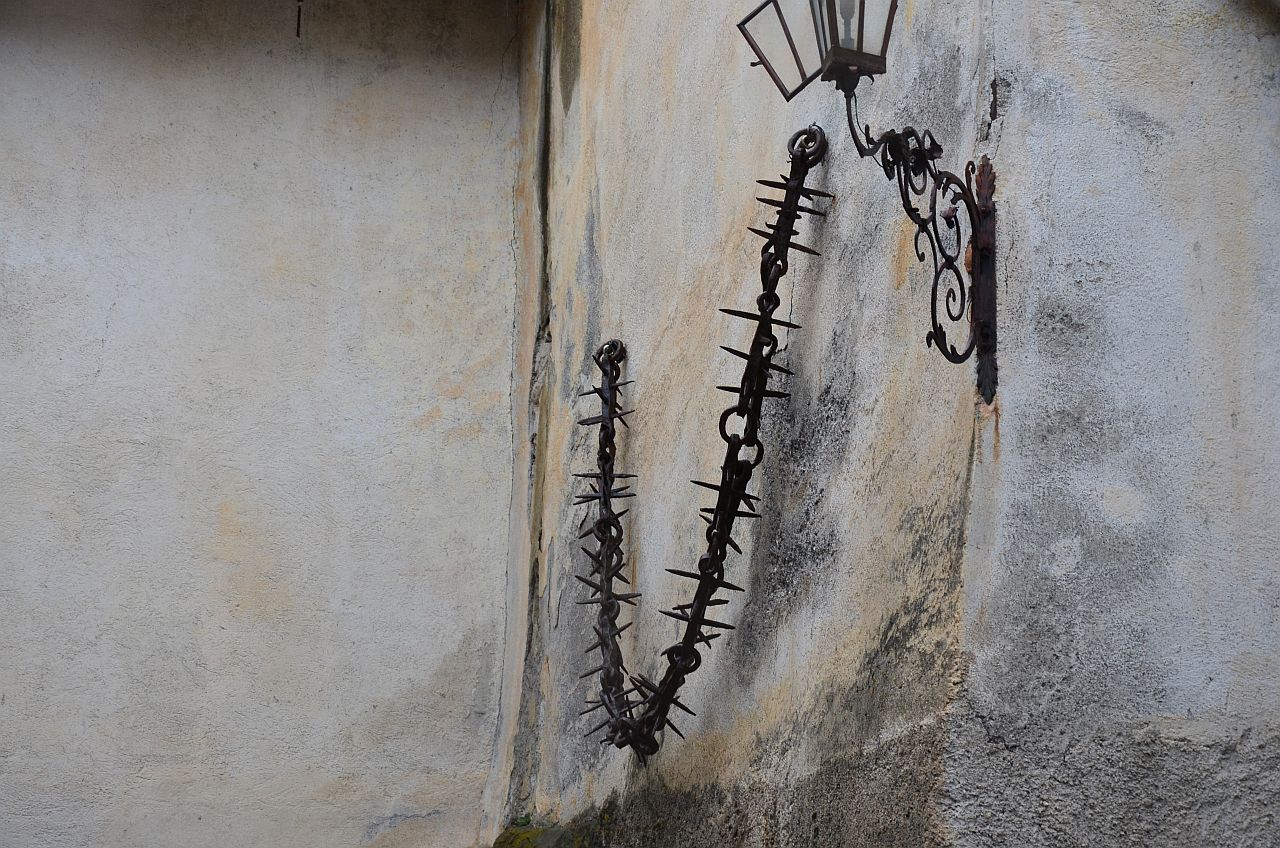Castelul nu păstrează foarte multe obiecte din vremurile medievale, doar o mică colecție de arme și un lanț cu țepi folosit pentru a pune piedică cailor în timpul unor ambuscade. Nu am văzut nicio bucătărie medievală, dormitoare de atunci, săli de tron sau cavalerești. Doar câteva tapiserii, niște vitralii, un șemineu cu o sculptură superbă.