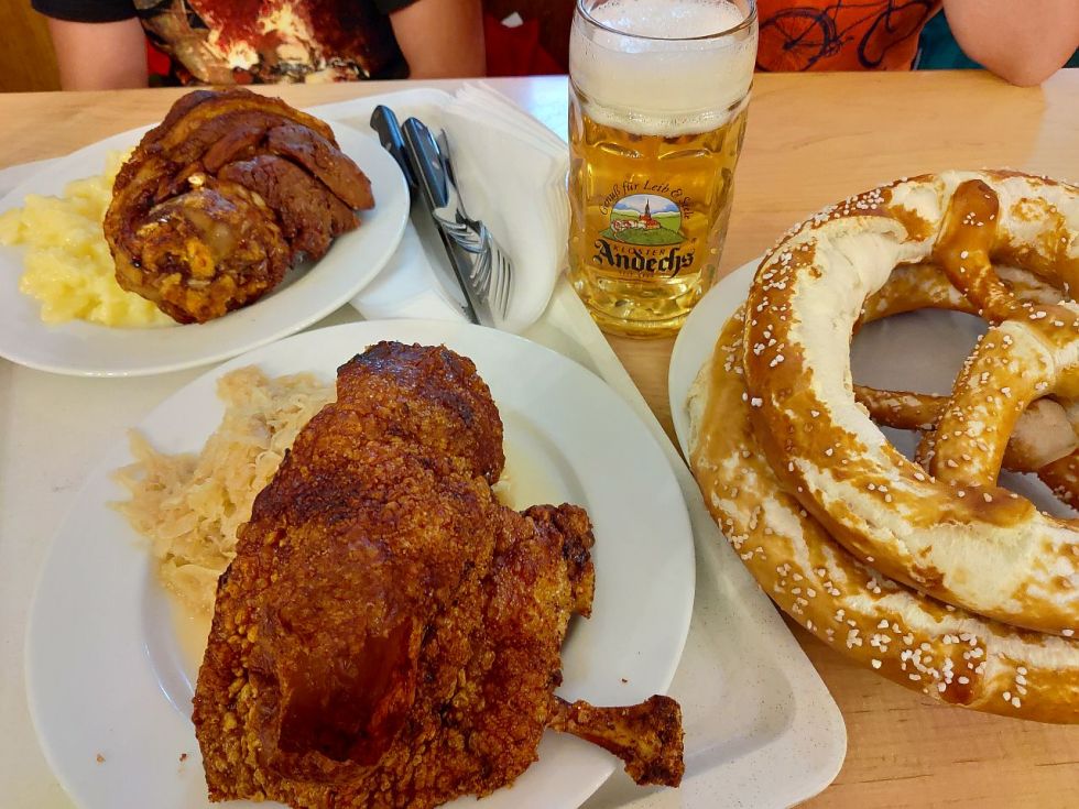 Spre seară, după o partidă de shopping, ne-am ostoit foamea la Mănăstirea Andechs… un haxe (ciolan de porc crocant la exterior), niște vărzucă călită, o salată de cartofi, covrigi uriași și ceva bere de la sfânta mănăstire. Tipic bavarez…