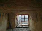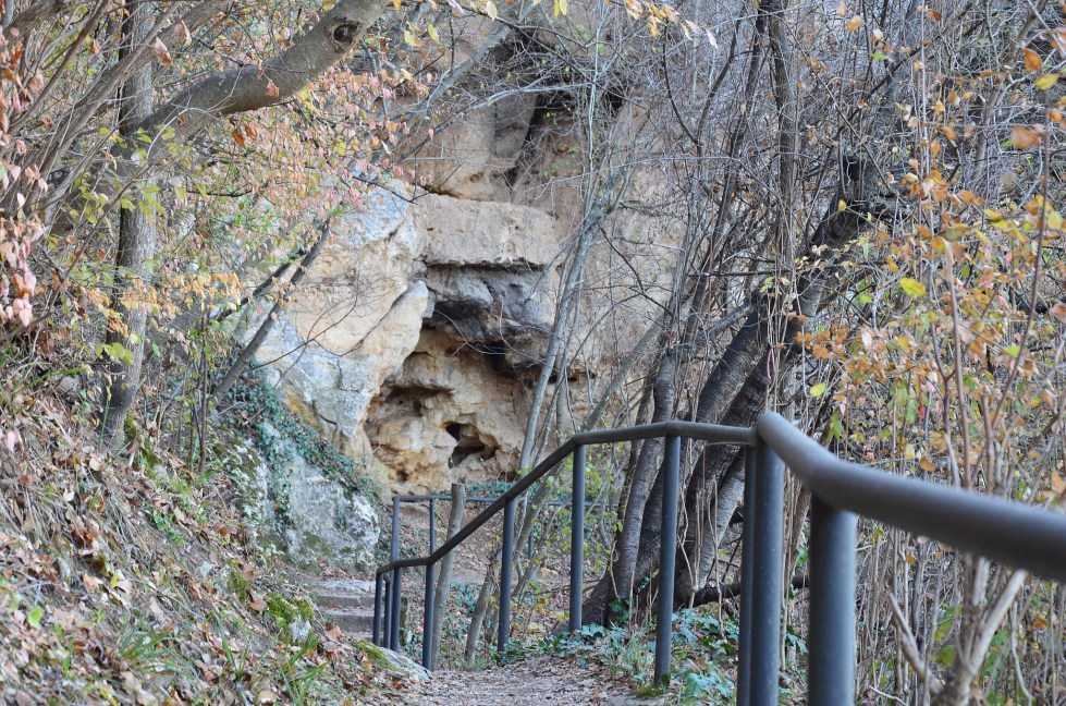 Am lăsat mașina la poalele muntelui, într-o parcare amenajată, apoi am urcat vreme de 15 minute către locul în care fost săpată micuța biserică, pe o potecă amenajată cu scări și cu balustrade de protecție.