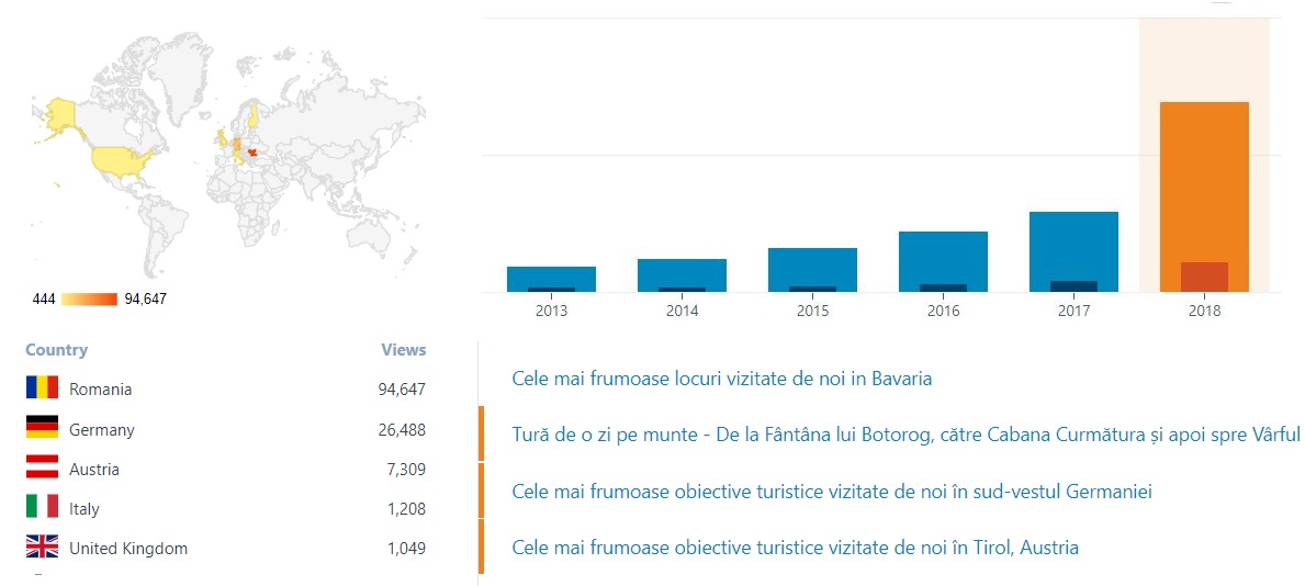 Mulți vizitatori din România ai acestui jurnal de călătorii, dar foarte mulți au venit din Germania și alte țări europene (aproape 30%). Atenție, nu este un blog comercial și nici nu va fi, hailaplimbare.ro va rămâne în continuare un sumar al obiectivelor turistice care ne-au rămas în suflet. Un jurnal cu amintirile deosebite trăite de noi, în familie.