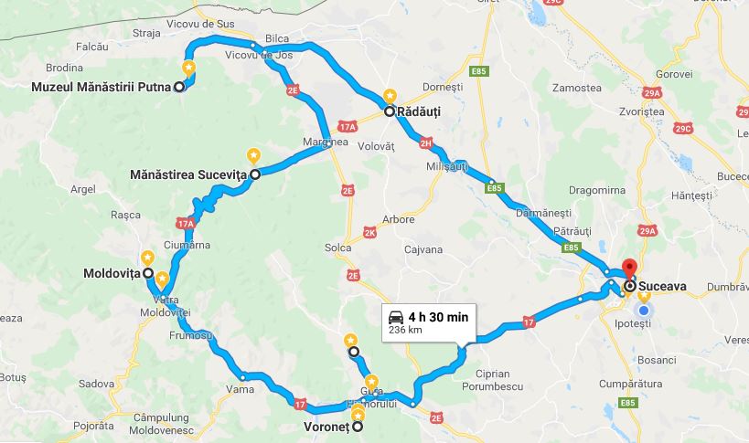 Clar este o plimbare care poate fi făcută într-o singură zi, dacă aveți o mașină la dispoziție și plăcerea de a conduce, chiar și pe drumuri nu tocmai ok, unele chiar jalnice. Mai sus aveti o hartă cu punct de plecare din Suceava, unde veți găsi cu siguranță și alte obiective turistice interesante.