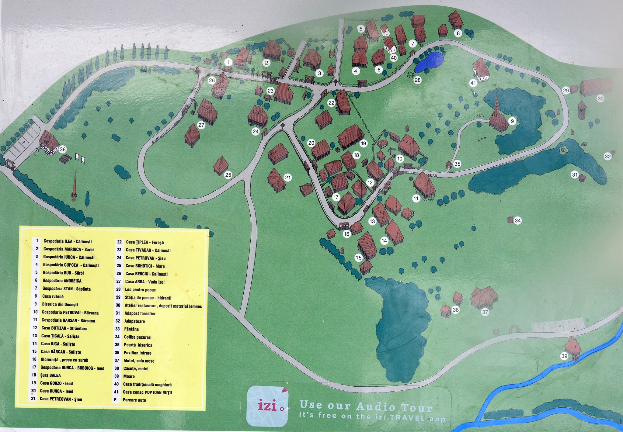 Un sat-muzeu de altfel, cu gospodării din principalele zone ale Maramureşului (Cosău – Mara şi Iza Inferioară până la Strâmtura, Iza Mijlocie, Vişeu – Borşa, subzona Tisei şi a bazinului Ruscova). Am văzut gospodării cu case construite din lemn, majoritatea cu porți maramureșene frumos sculptate la intrare, cu dependințele necesare, cu uneltele de lucru agățate de pereții exteriori, cu acoperișurile acoperite cu șindrilă.