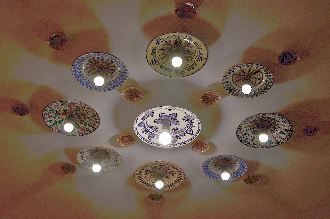 O altă idee sunt și lustrele sau spoturile de lumină, decorate cu farfurii de ceramică, pe care le-am văzut în mai toate camerele.