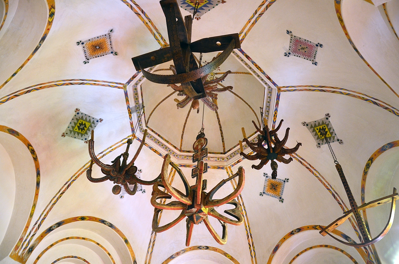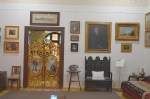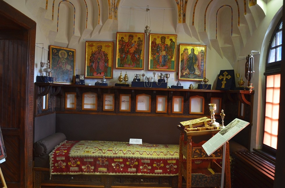 Din dormitor am intrat în micuța capelă, construită pentru a adăposti colecția de artă religioasă adunată de doctor. Tavan boltit, de care atârnă candelabre țărănești din lemn, icoane brâncovenești de secol XVIII pictate într-un atelier vâlcean, dar și o poartă împărătească, care se vede mai bine dintr-o altă cameră.