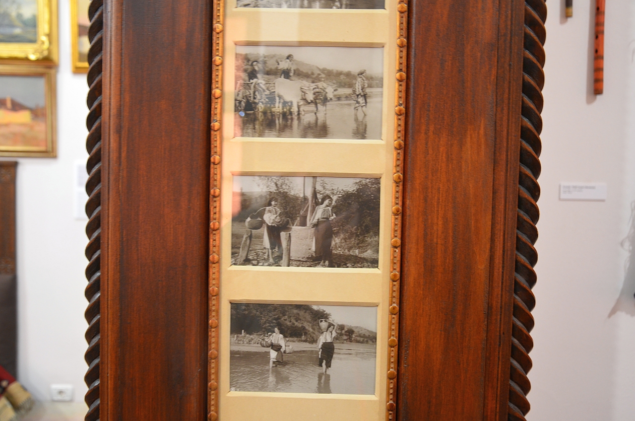 Încă un detaliu mi-a atras atenția, anume acele poze pe teme din viața de la țară, încastrate în tocul din lemn care delimita salonul de camera miresei.