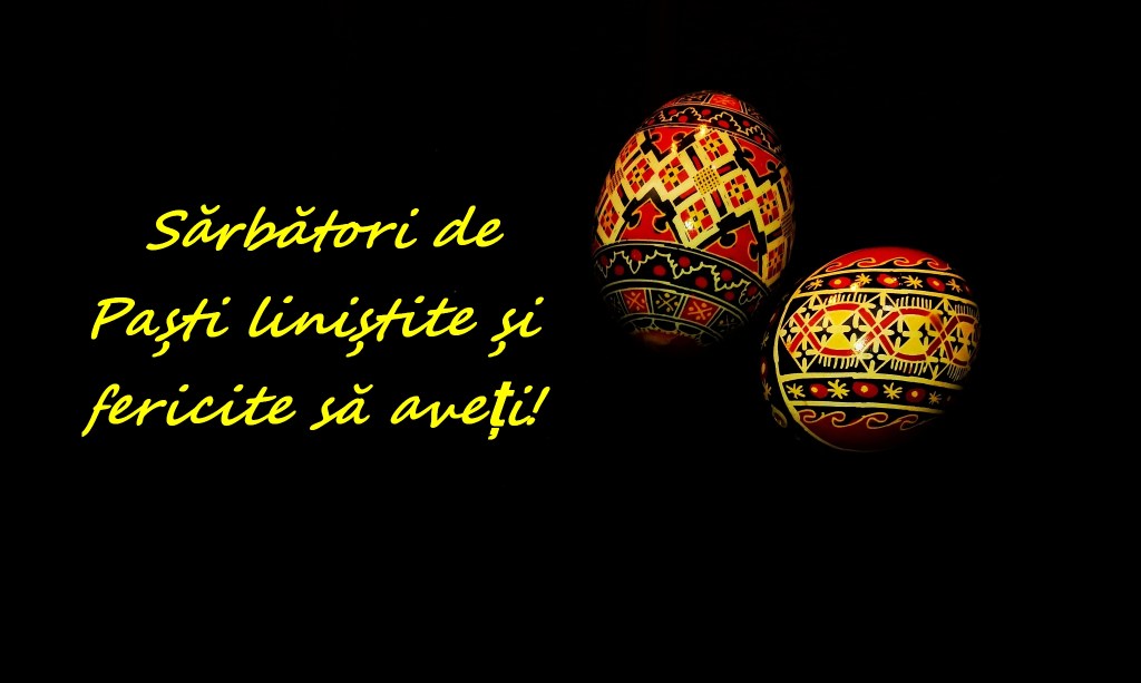 Vă doresc să aveți parte de Sărbători de Paști liniștite și fericite, alături de cei dragi vouă! Cu bucurie și pace, acasă, în sânul familiei sau într-un loc pe sufletul vostru, alături de prieteni și de oameni cu suflete curate.