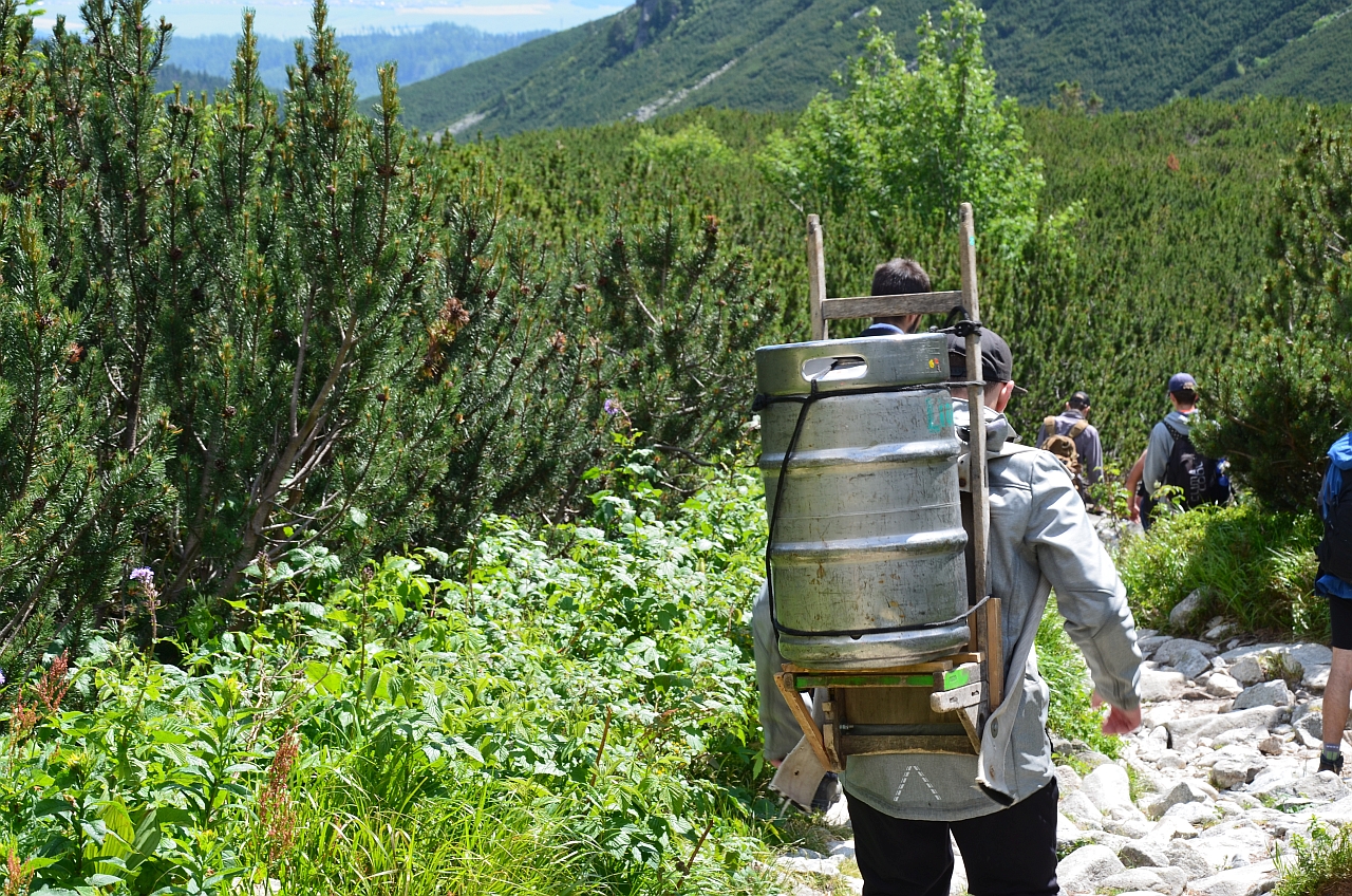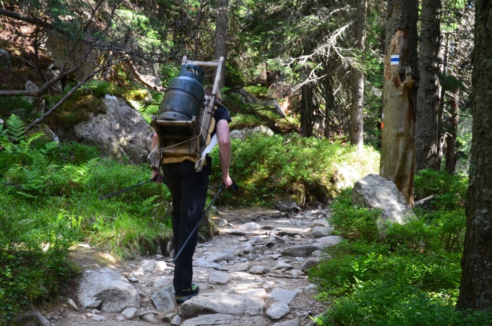 Pe drum ne-am întâlnit cu băieții care făceau aprovizionarea pentru cabana Rysmi, unul ducea în spate butoiul pentru bere, altul butelia goală ce trebuia schimbată, alții niște lăzi goale etc…