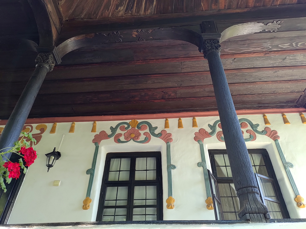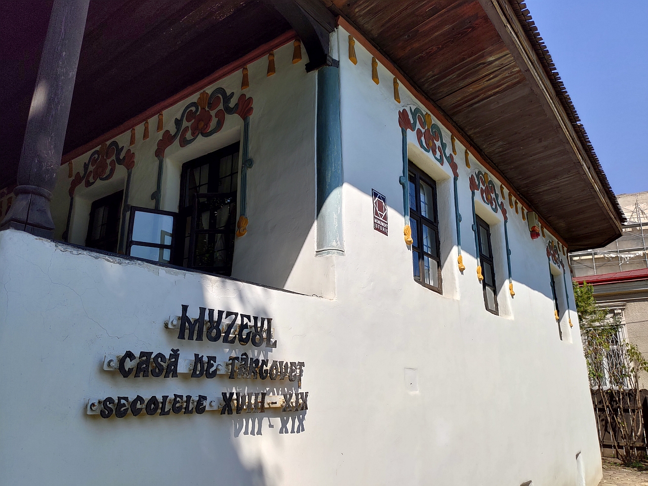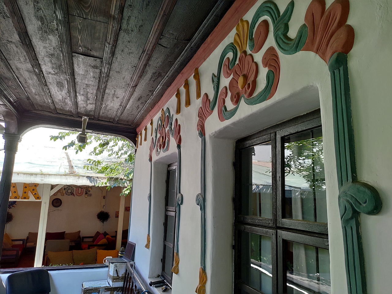 Dar, atenție, o casă de târgoveț cu motive orientale mai ales la interior. Exteriorul casei fiind într-un stil neo-românesc, brâncovenesc aș spune, cu un pridvor generos și decorațiuni florale la ferestre.