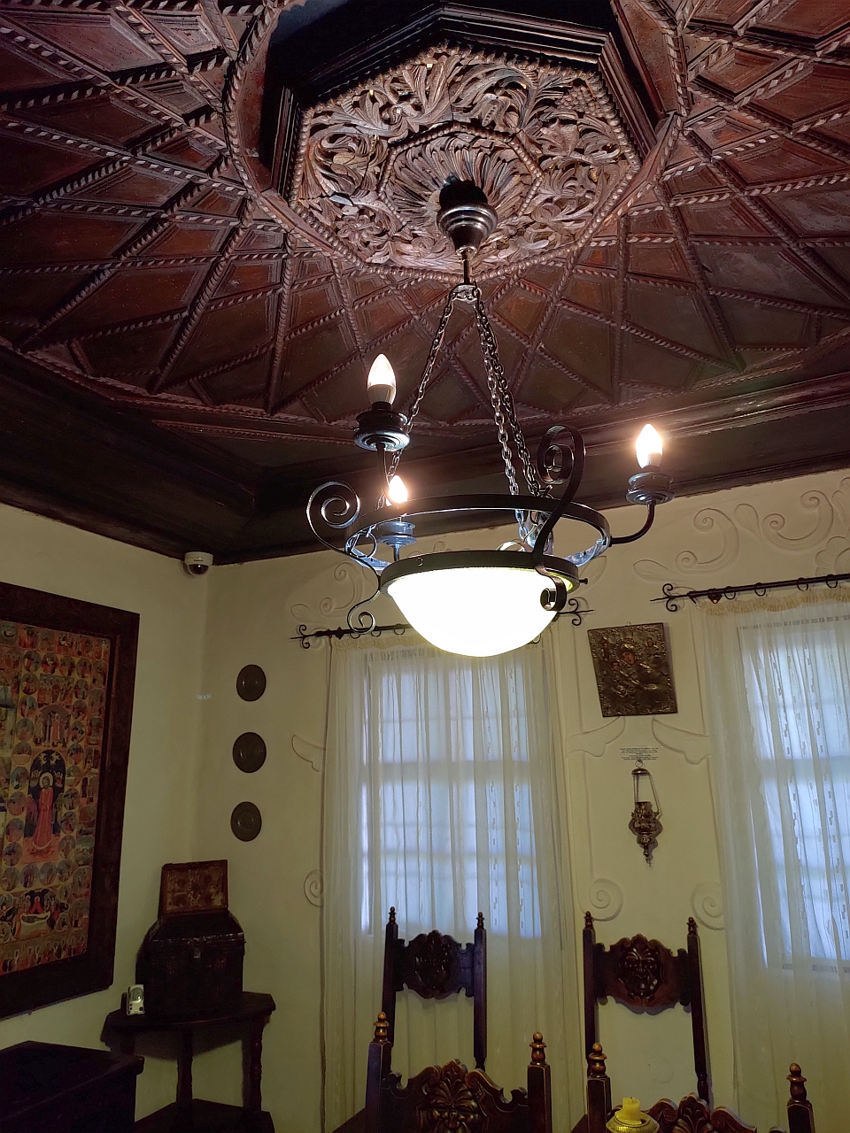 Și, după cum am mai spus, ne-a atras atenția și plafonul sculptat din lemn, într-o formă solară cu 22 de raze ce pornesc dintr-un disc solar, motiv oriental dar destul de întâlnit și în tradițiile populare de la noi. După cum am mai spus, adus din Bulgaria, de la Tryavna.