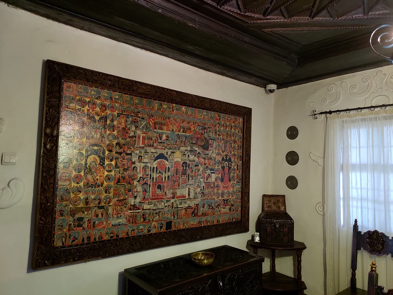 … unde ne-a atras atenția în primul rând o icoană cât tot peretele, adusă de către Hagi Prodan de la Ierusalim, pe care sunt pictate scene biblice. Superbă icoană, unicat, eu nu am mai văzut una atât de mare și de complexă până acum.
