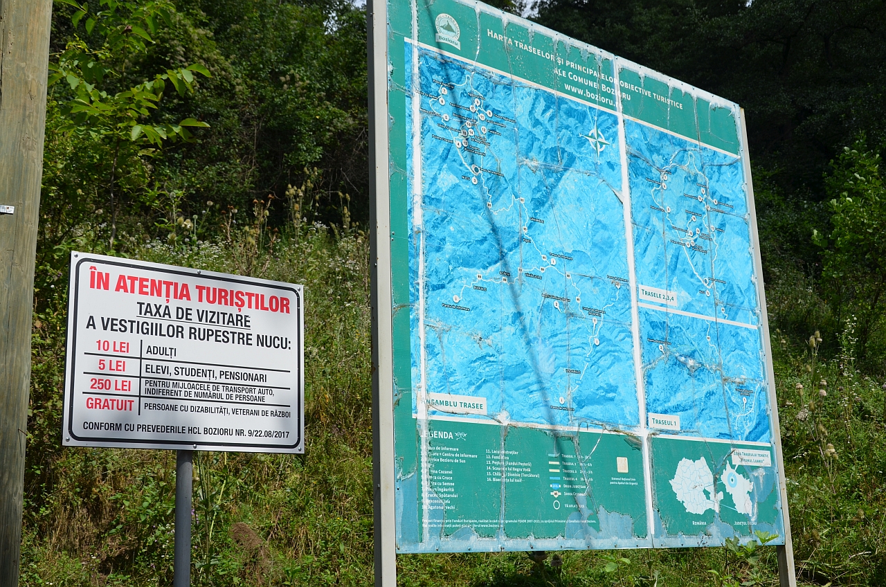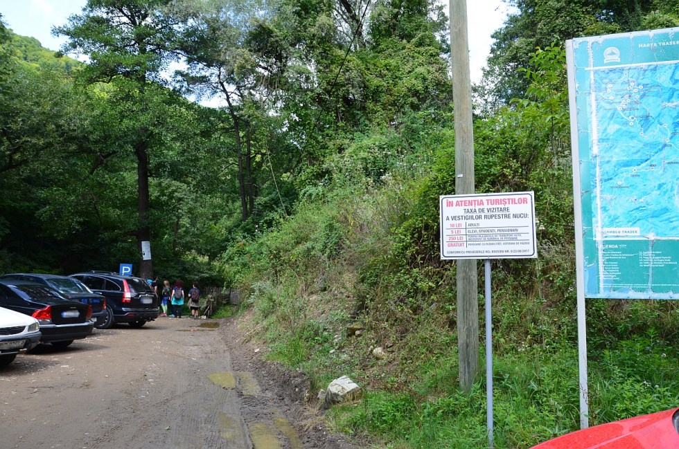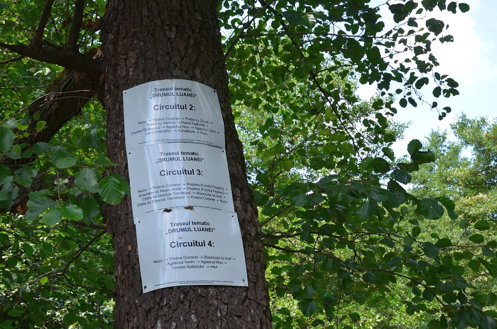 Parcarea din Nucu, de unde încep traseele prin Țara Luanei, poate acomoda maxim 10 mașini. La intrare am întâlnit un panou informativ cu cele patru trasee ce pot fi luate la pas, unele mai scurte, altele mai lungi, unele mai ușoare, altele mai dificile. Așa că, dacă sunt mai multe mașini decât încap în parcare și pe lângă, va trebui să mergeți înapoi pe drum, pentru a găsi un loc liber pe marginea acestuia.