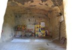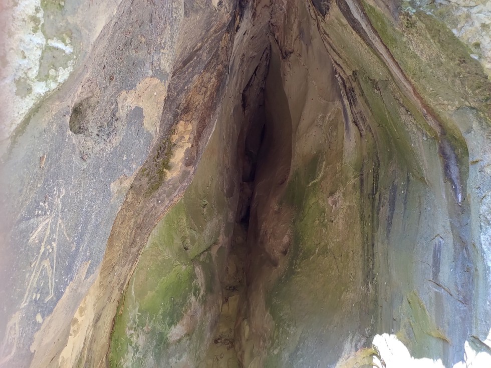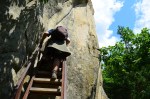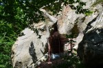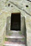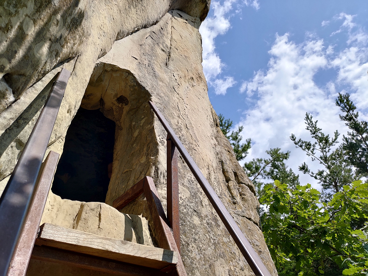 La care există scări pentru acces. Numai că ușa săpată în stâncă nu este făcută cam pentru orice gabarit… Intră doar cei mai subțirei…