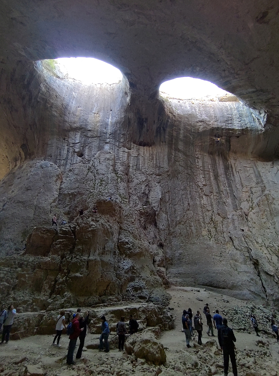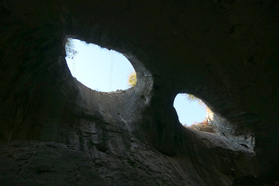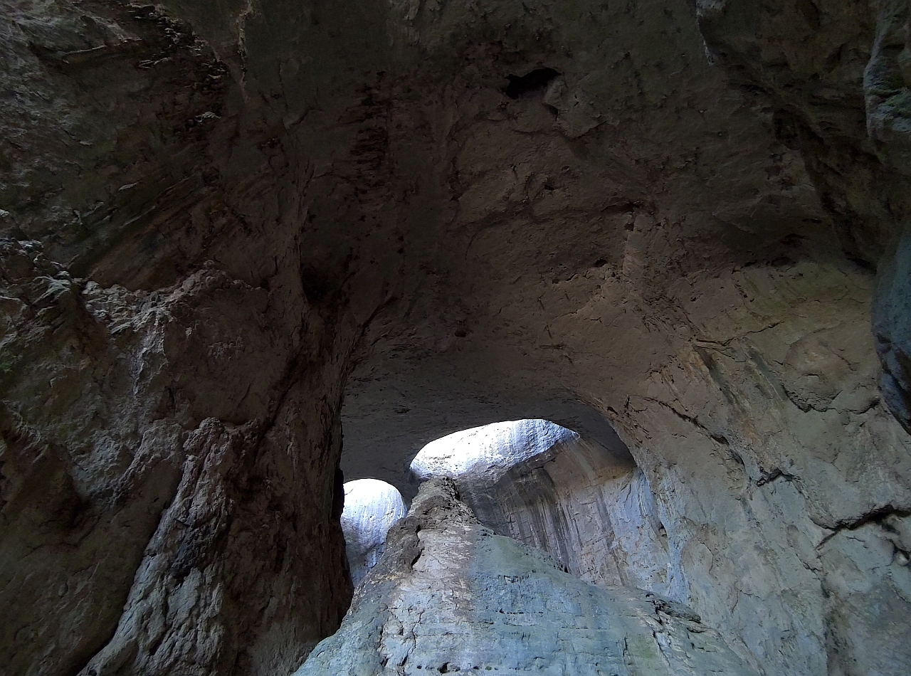 Două spărturi în formă de ochi din tavanul peșterii care te fac să simți că ești sub privirea Creatorului… Practic, m-au luat fiorii când priveam în sus, m-a furnicat pe spate… Parcă ești la Judecată, te simți mic și neînsemnat în fața creației Mamei Natură…