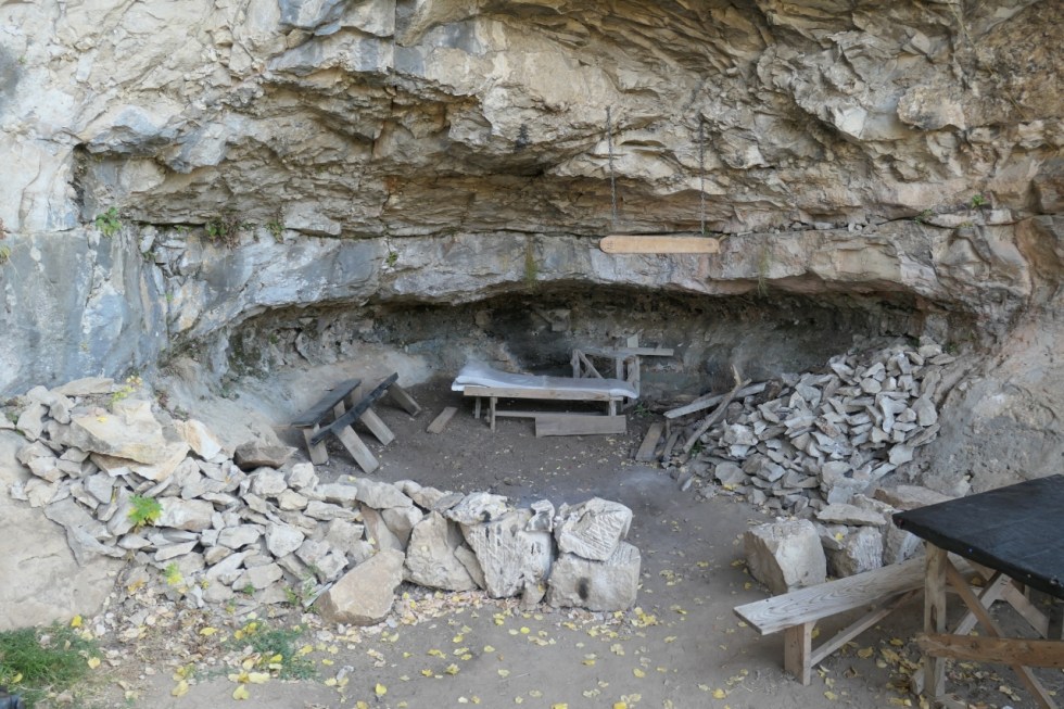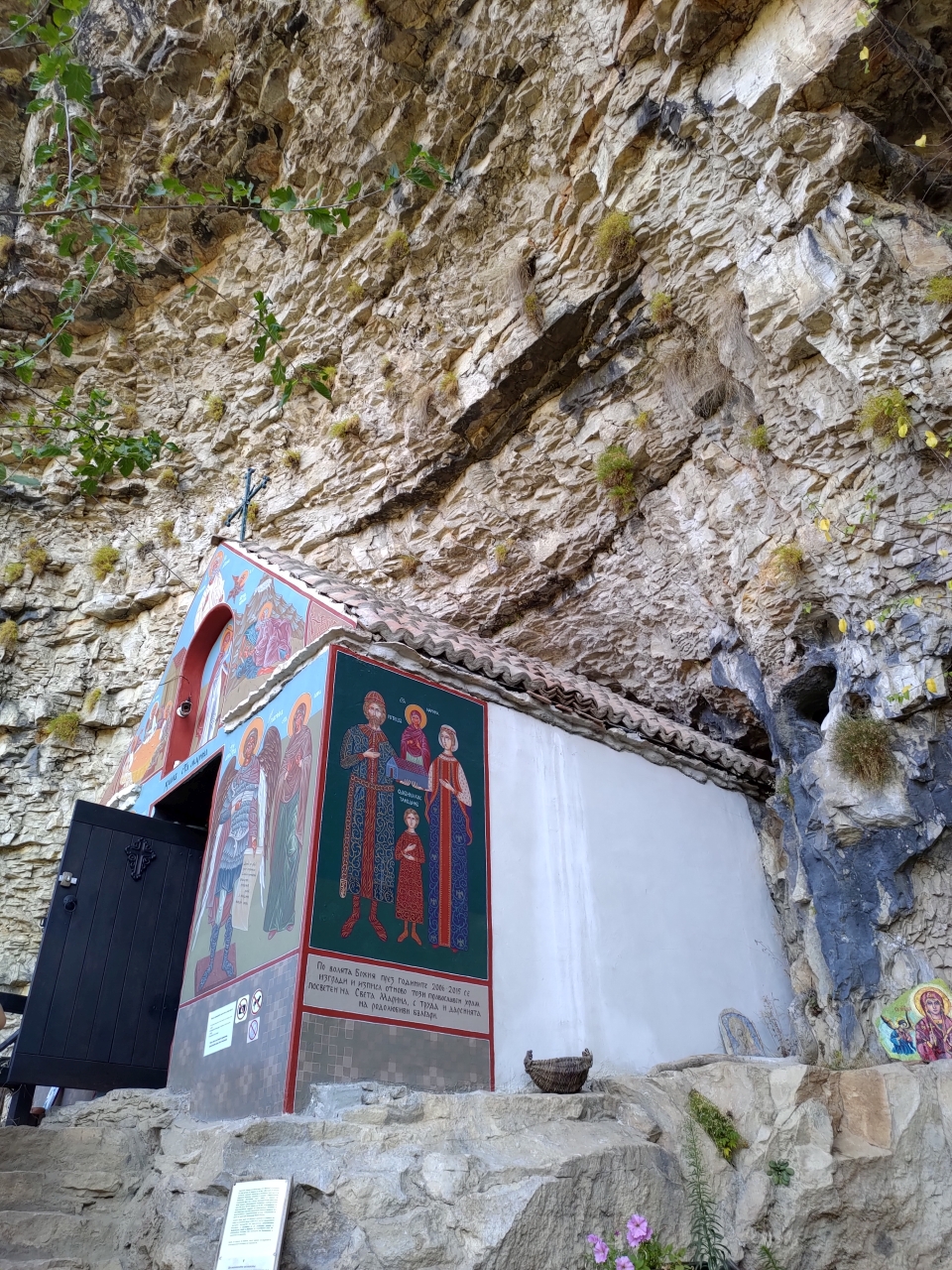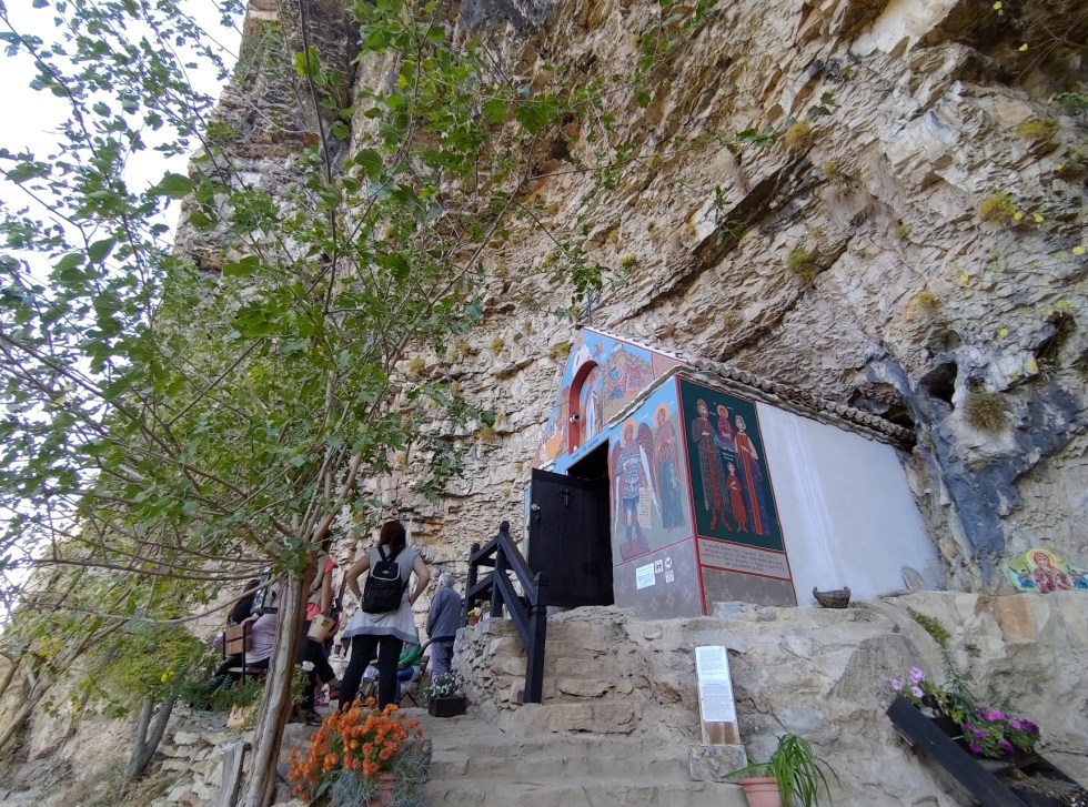 O mică bisericuță clădită în bolta de sub stâncă, despre care am citit pe internet că ar data din secolul XIV… Deci, rupestră cum ar veni. Și o mică terasă cu băncuțe pentru odihna pelerinilor dar și a turiștilor… Atât.