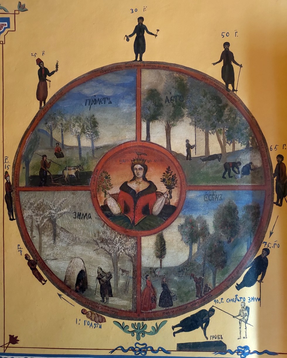 O așa roată a vieții am văzut și la Mănăstirea Preobrajenie, lângă Veliko Târnovo.