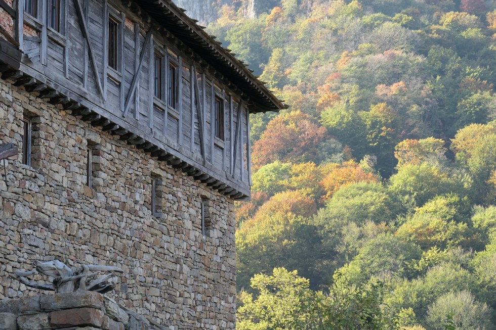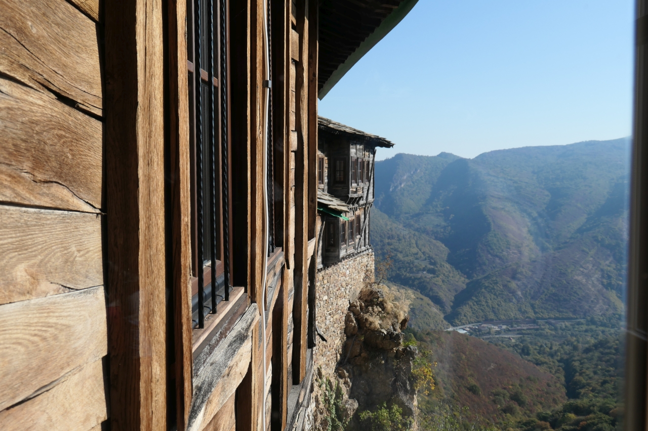 Structură de piatră… chilii din lemn… acolo sus în vârful muntelui, aproape că zici că este o cetate adevărată, construită să domine împrejurimile…