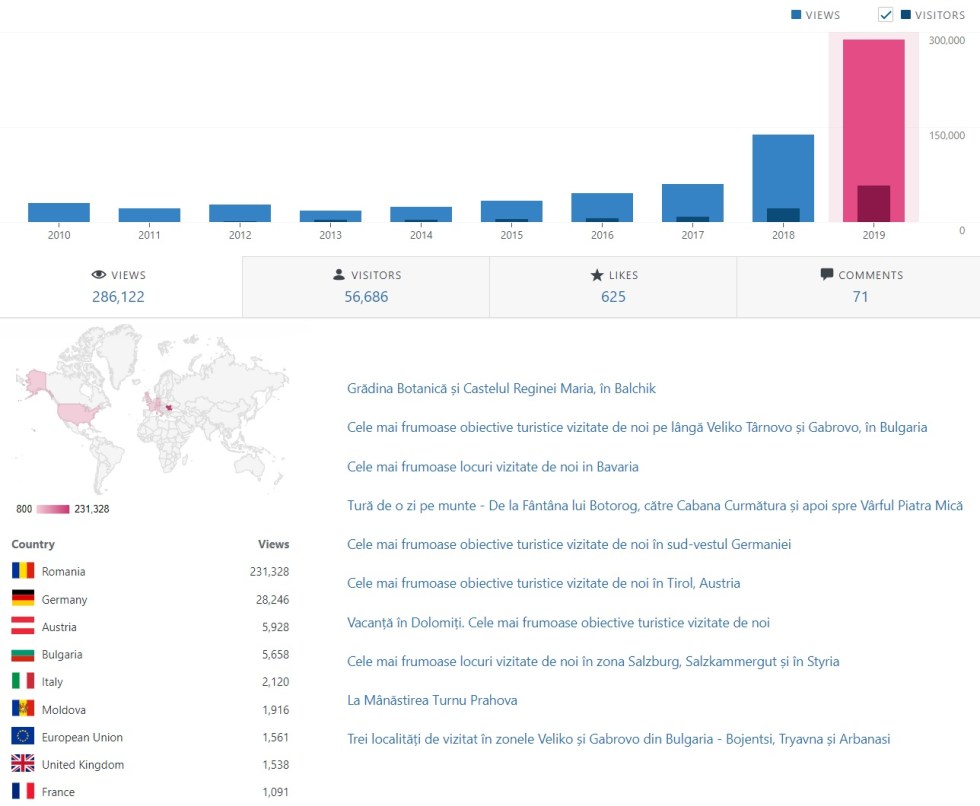 Despre toate am scris pe acest jurnal de călătorie online, din toate v-am arătat multe, multe imagini. Clar este că din toate aceste plimbări de vacanță ale noastre au rezultat articole care, la rândul lor, au generat un trafic dublu față de anul precedent. Atât ca număr de vizitatori unici, cât și al cuantumului vizualizărilor.