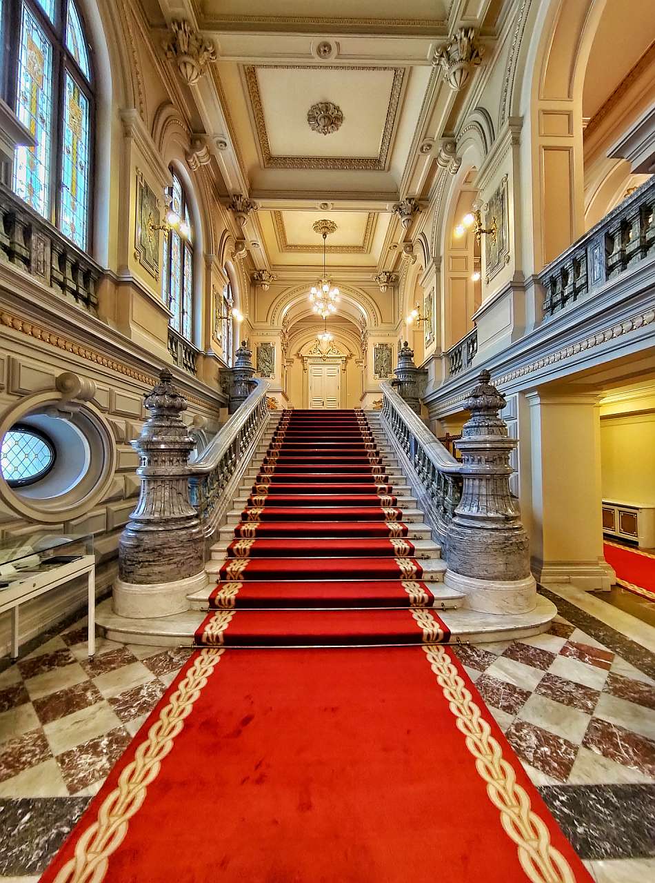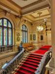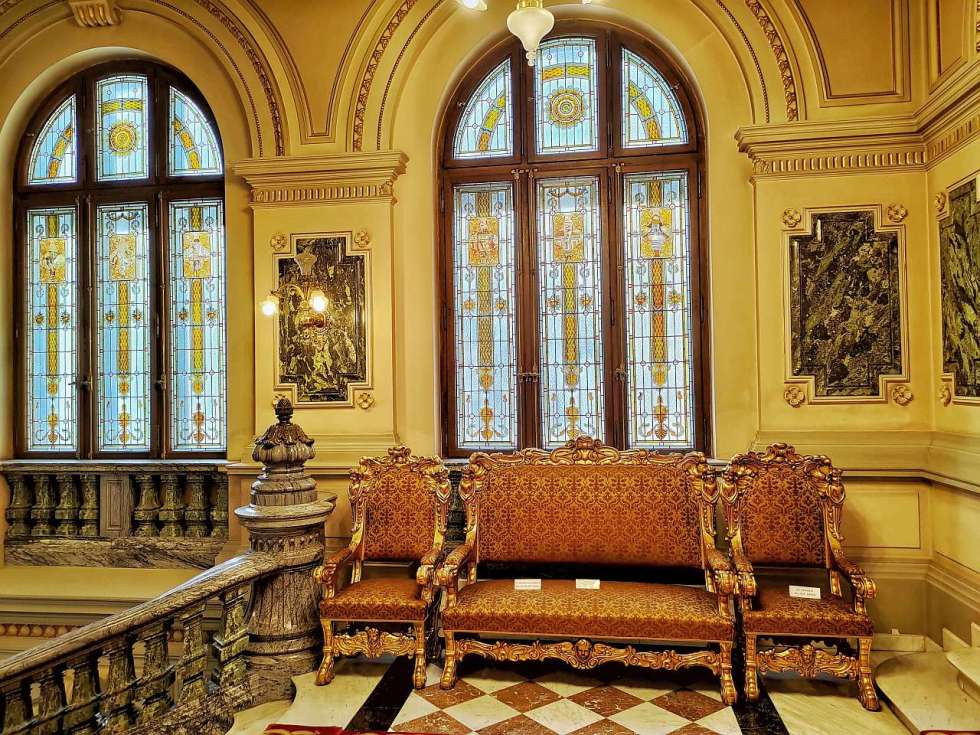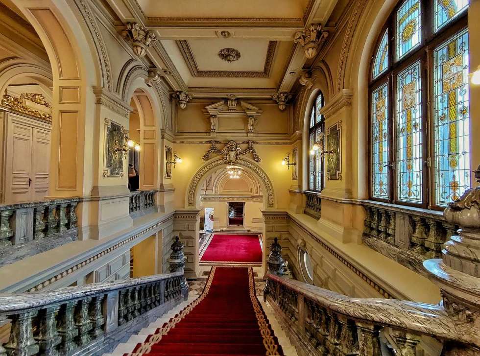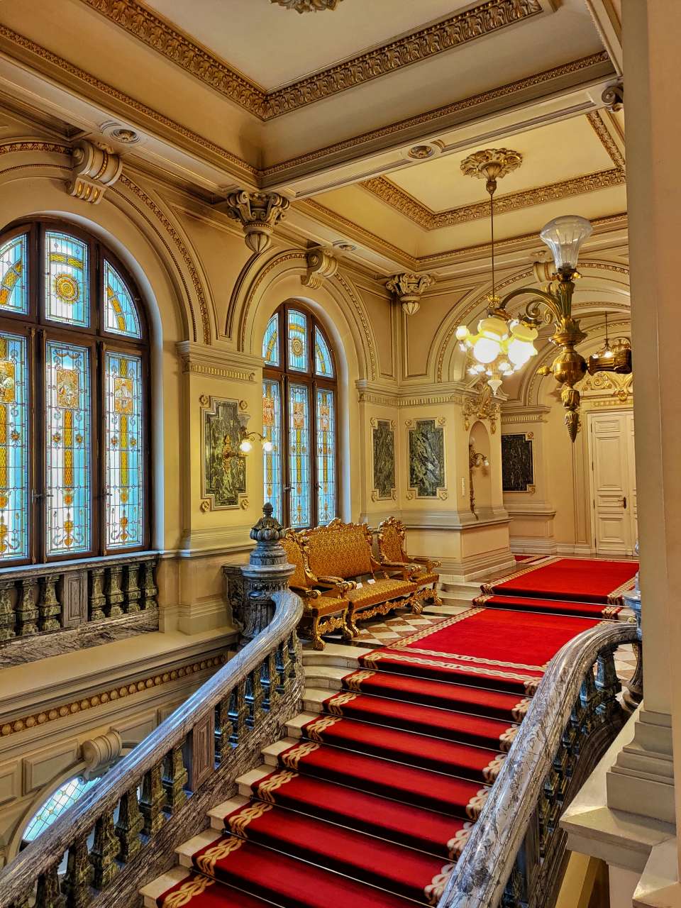 … Holul de Onoare, decorat într-un stil eclectic și inspirat de foyer-ul Operei Garnier din Paris. Am pășit pe impresionanta scară din marmură italiană care face legătura cu primul etaj al palatului. Să mai spun că toate ferestrele aveau vitralii? Iar unele dintre ele descriau scene din legenda meşterului Manole…