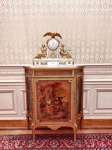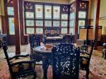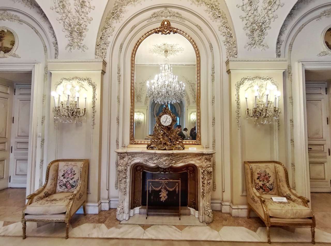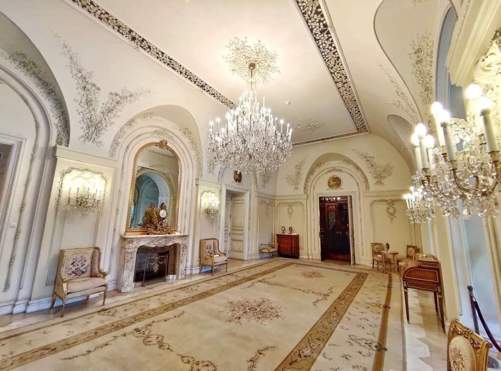 … în care mobilierul este compus din scaune, fotolii, canapele din lemn sculptat şi aurit, tapiţate cu mătase naturală, brodată manual. Ștucatura cu flori de pe pereți era aurită în acele vremuri…