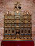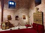 … unde am văzut cea mai mare parte a tezaurului liturgic recuperat de la vechea mănăstire – icoane, elemente ale altarului, candele, ba chiar și candelabrul mare și alte obiecte de cult. Mi-a atras atenția piatra de mormânt a prințului Mircea și monumentul funerar al principesei Maria, fiica lui Carol I, sculptat de Karl Storck. Iar colecția de icoane este superbă…