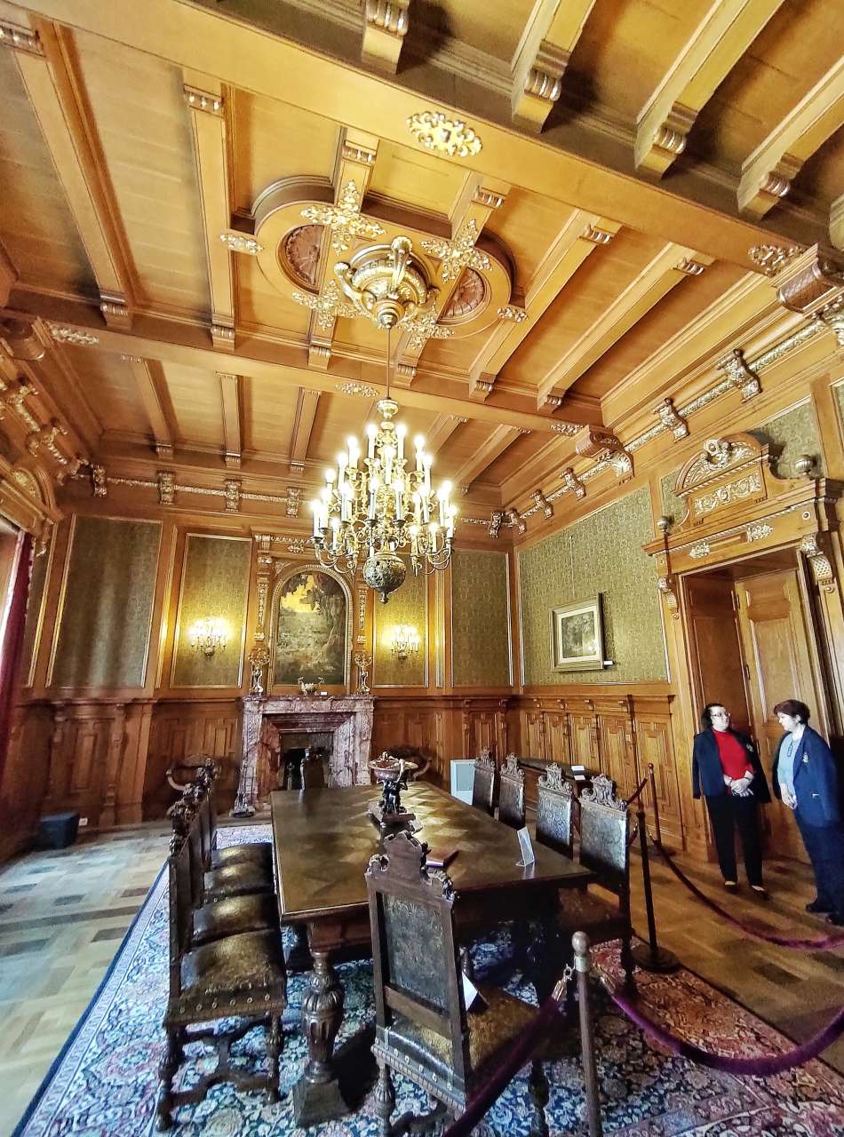 … denumită și Sufrageria lui Carol I, pentru că a fost decorată după gusturile acestuia. Lambriuri sculptate din lemn, masă și scaune sculptate din lemn de nuc, tapiserie cu o scenă de vânătoare, semineu… Interesant este că șemineul are doar un rol decorativ, pentru că palatul a avut încălzire centrală încă de la început.