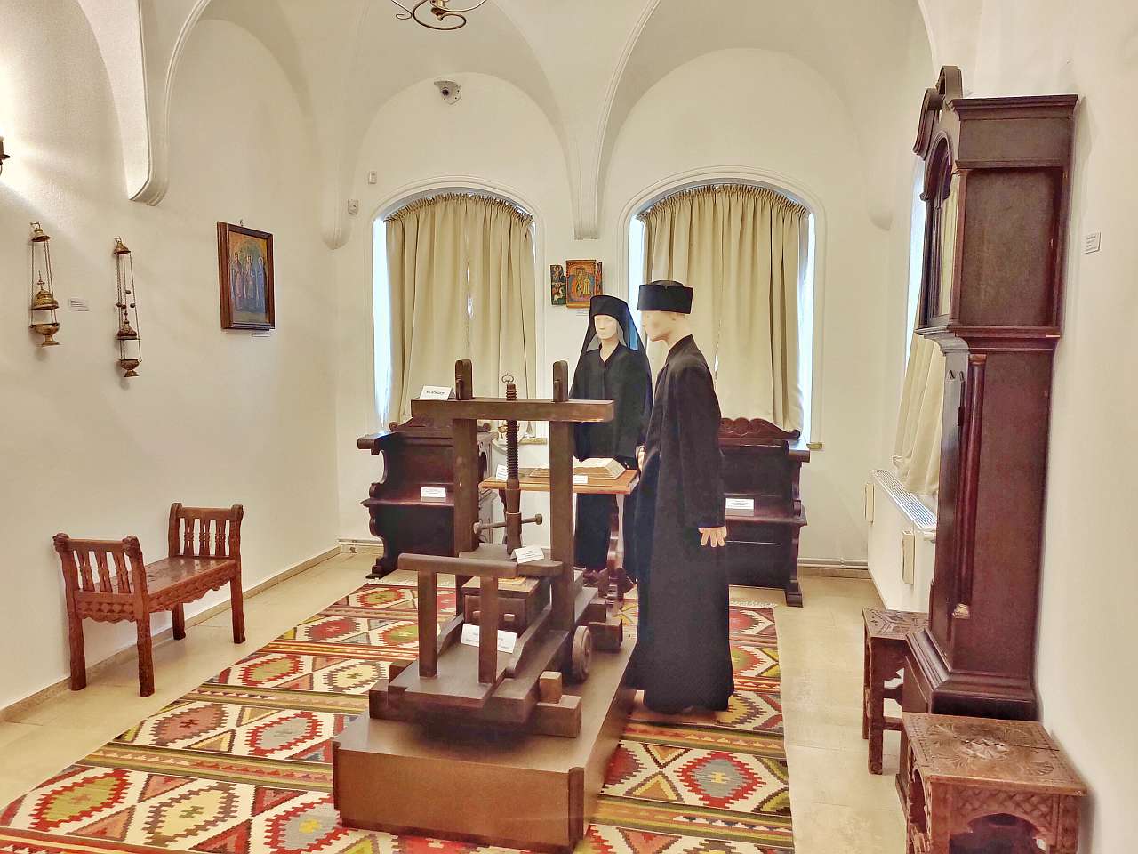 Turul a continuat într-o încăpere în care este prezentată o tipografie mănăstirească, cu o copie a unei tiparnițe din acele vremuri…