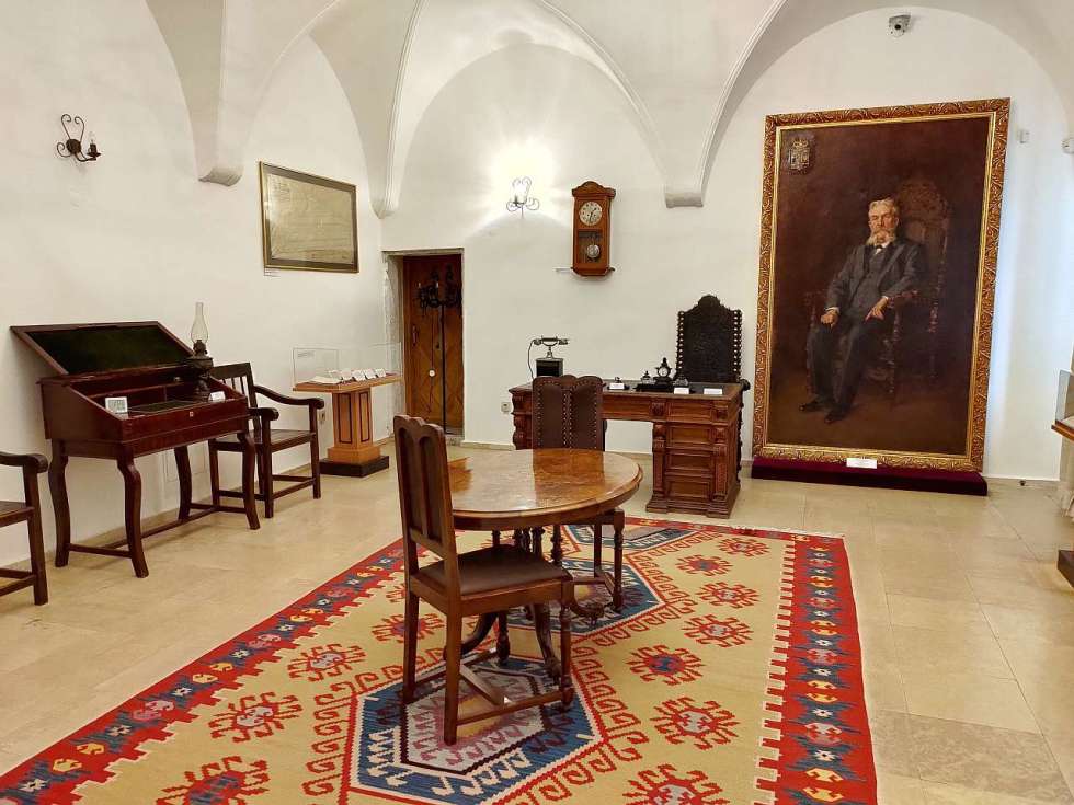 Mobilier de birou specific acelor vremuri, instrumente de scris, un ceas, o micuță vitrină cu manuscrise…