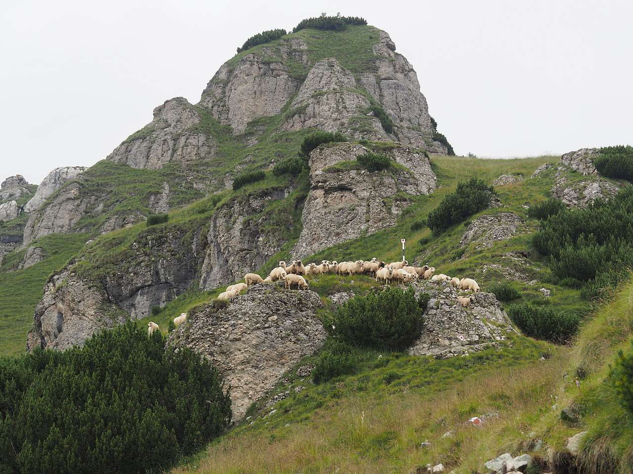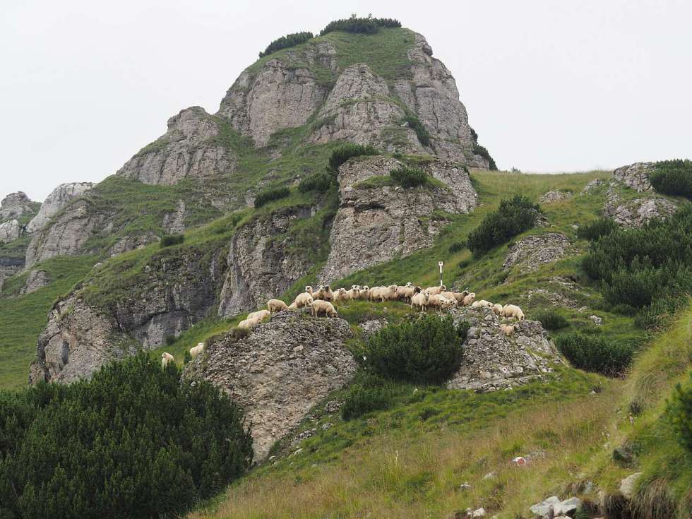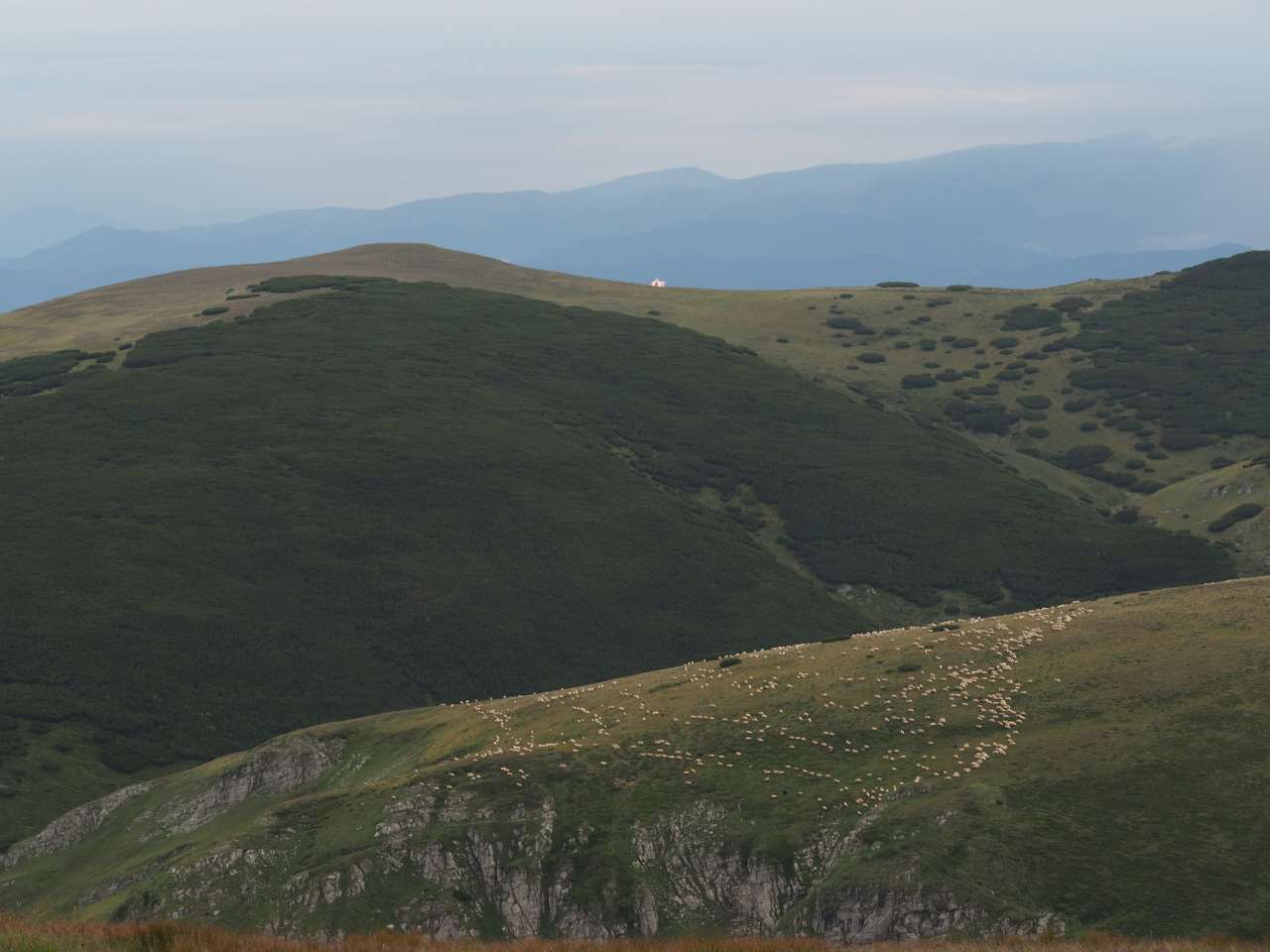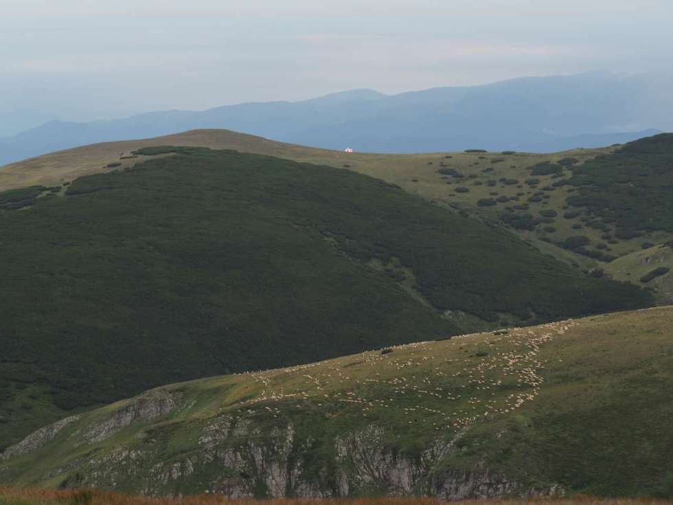 … privirea în dreapta din nou, către refugiul Șaua Bătrâna… dar și la turma de mioare ce păștea pe culmea din apropiere…