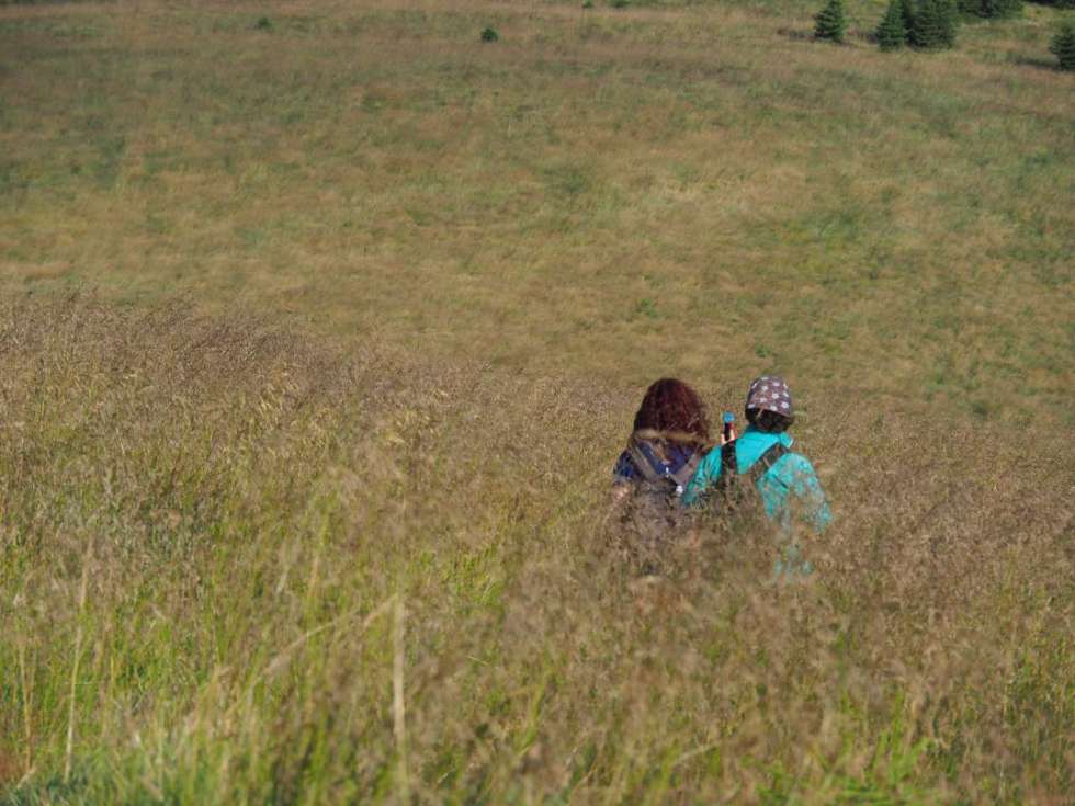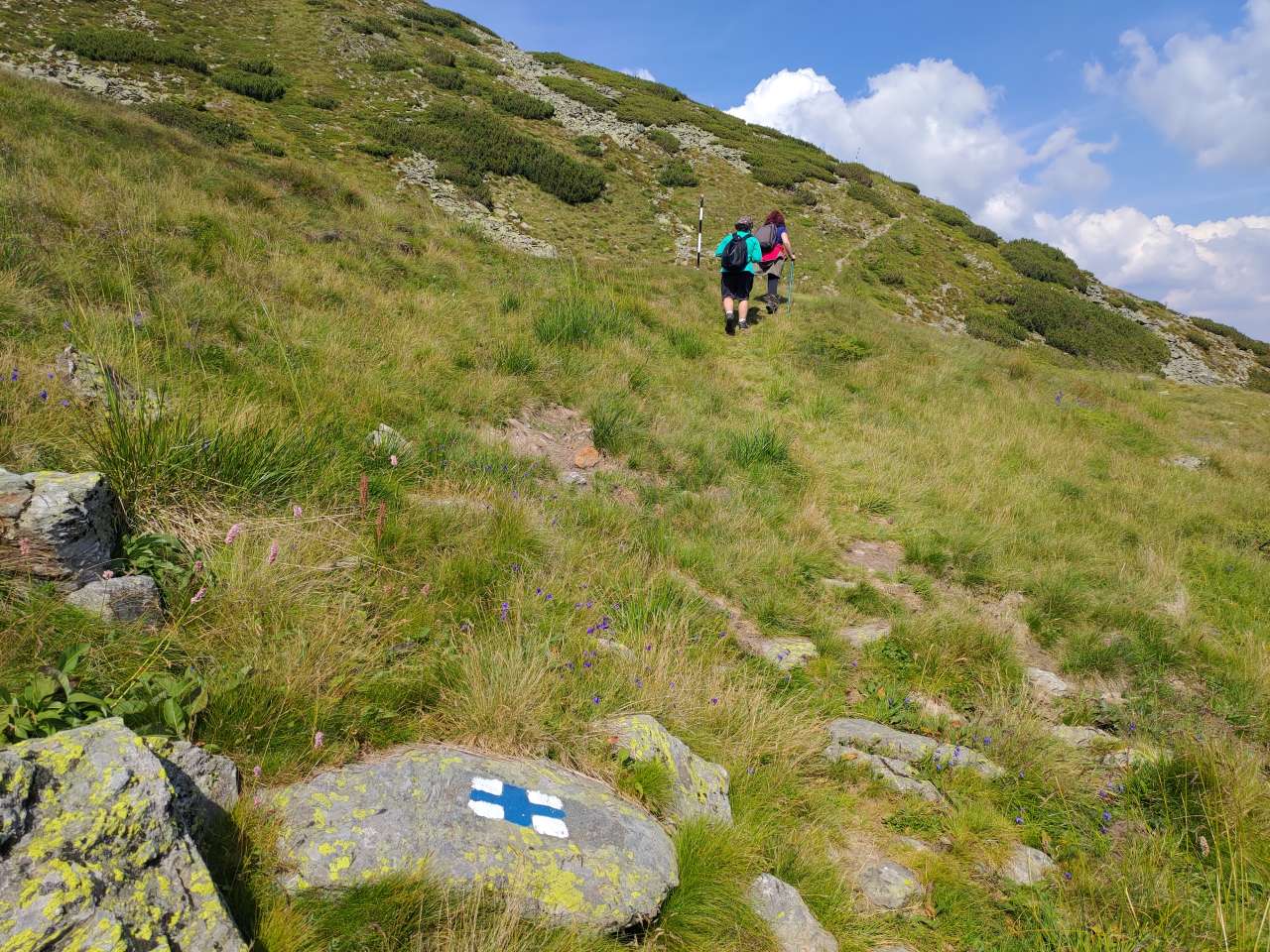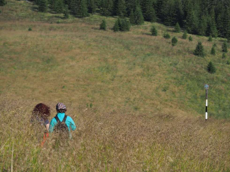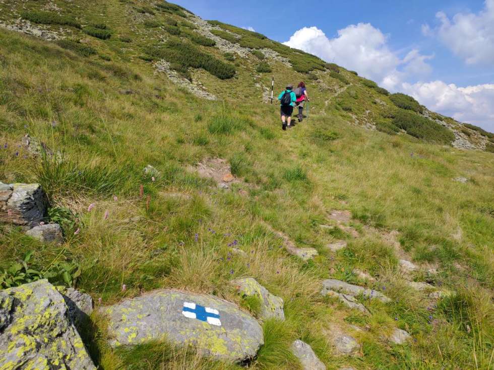 După maxim 20 de minute de mers pe creasta cu potecă lină și cu peisaje minunate am început coborârea….