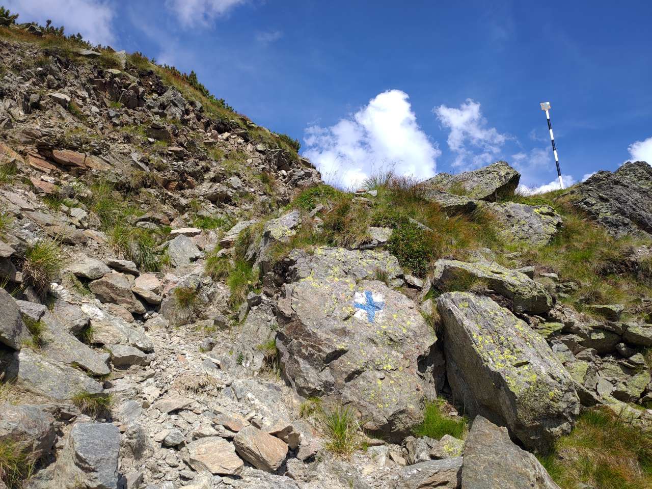 Și la cât de abruptă fusese urcarea, ne gândeam că genunchii noștri vor suferi crunt pe coborâre, așa că urma să o facem extrem de încet și de prudent. Planul era să mergem înapoi pe traseul marcat cu Cerc Albastru, pentru că Crucea Albastră de pe creasta Muntelui Iezerul Mare era mai lung, conform indicatoarelor întâlnite.
