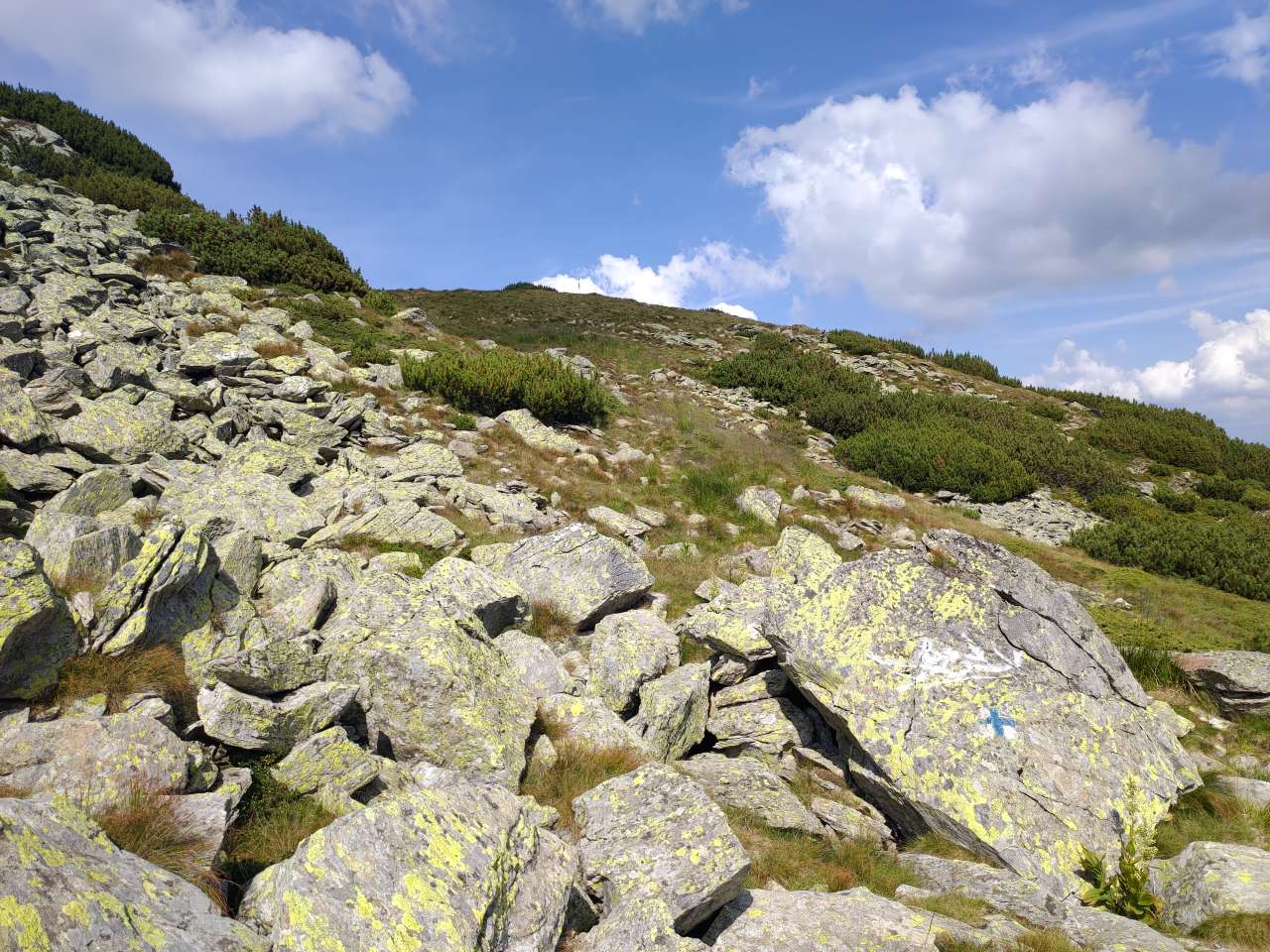 … pe o pantă destul de abruptă și de pietroasă dar cu peisaje minunate, care ne țineau ocupați în momentele de răgaz.