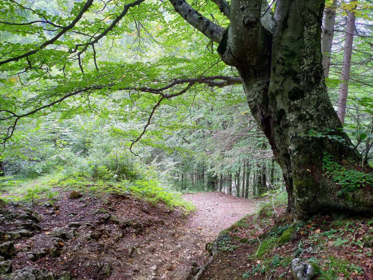 … pe o cărare destul de lată, într-o ușoară pantă descendentă. Practic, după aproape 1 oră de mers am ajuns în proximitatea satului Peștera, pe un drum forestier ce șerpuiește deasupra lui, pe la margea bătrânei păduri dacice de fagi…