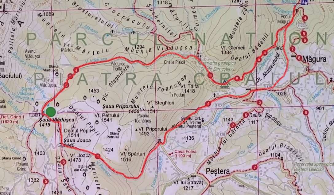 - Traseu – Circuit – Fântâna lui Botorog (820m) – Prăpăstiile Zărneștilor – Cheia Pisicii – Șaua Vlădușca – La Table (1415m) – Șaua Joaca (1445m) – sat Peștera – Dealul Munteanului – Fântâna lui Botorog