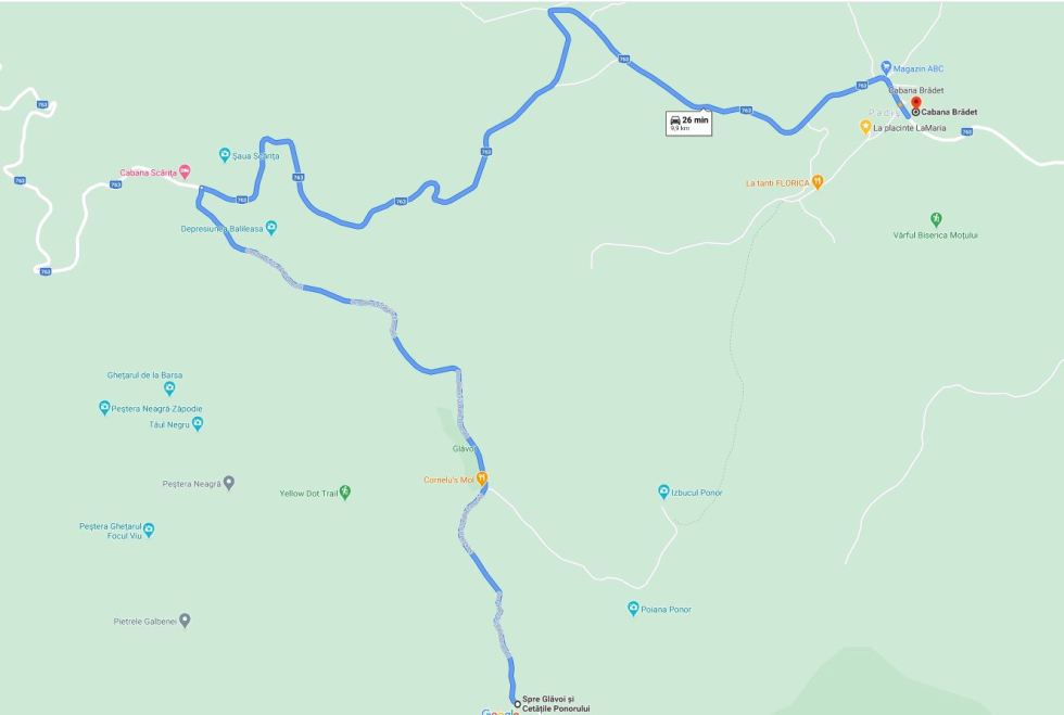 - Traseu – Drum forestier aproape de Cabana Cetățile Ponorului – Dolina1 – Portal – Dolina 3 – Intrarea în peștera Cetățile Ponorului – Balcoanele Ponorului – Avenul Borțig – Înapo pe traseu ocolitor către punctul de start