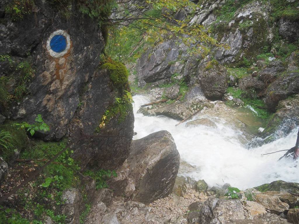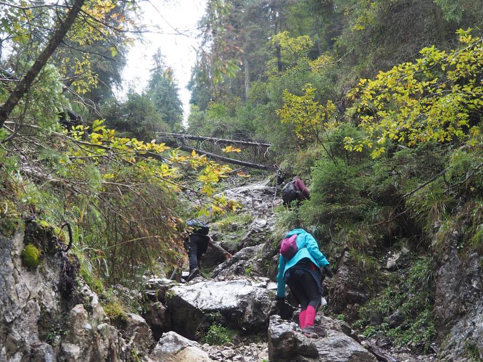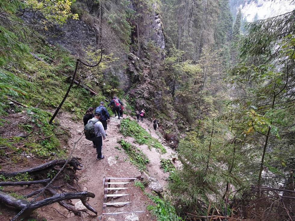 … mai puțin aproape de final, când a trebuit să coborâm printre doi pereți verticali, pe o cărare stâncoasă, abruptă, cu praguri înalte și pe care încălțările alunecau destul de tare…