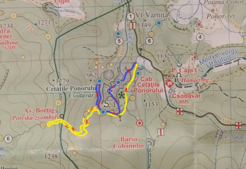 - Marcaj – Circuitul Cetăților Ponorului bulină albatră, către avenul Borțig bulină galbenă, înapoi pe bulină galbenă
