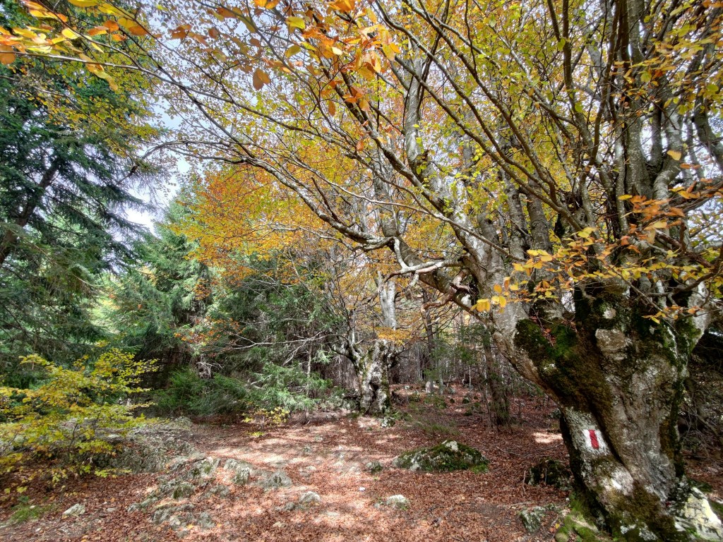 După cum am spus, după aproape 2 ore am ajuns în șaua Groapele, de unde am ales să mergem mai departe prin pădure, către șaua Joaca și apoi către La Table, unde mai fusesem cu aproape o lună în urmă. Traseul este marcat de acolo cu dungă roșie.