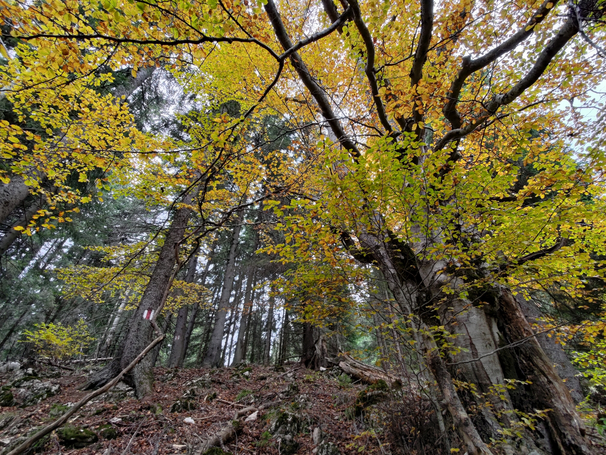 După cum am spus, după aproape 2 ore am ajuns în șaua Groapele, de unde am ales să mergem mai departe prin pădure, către șaua Joaca și apoi către La Table, unde mai fusesem cu aproape o lună în urmă. Traseul este marcat de acolo cu dungă roșie.