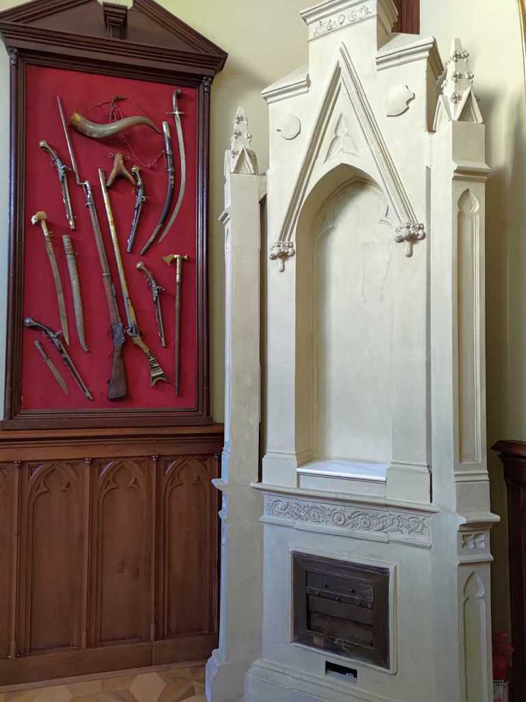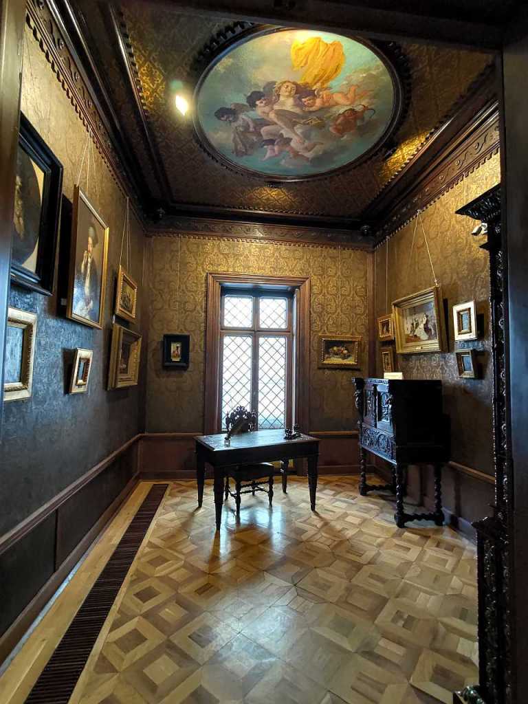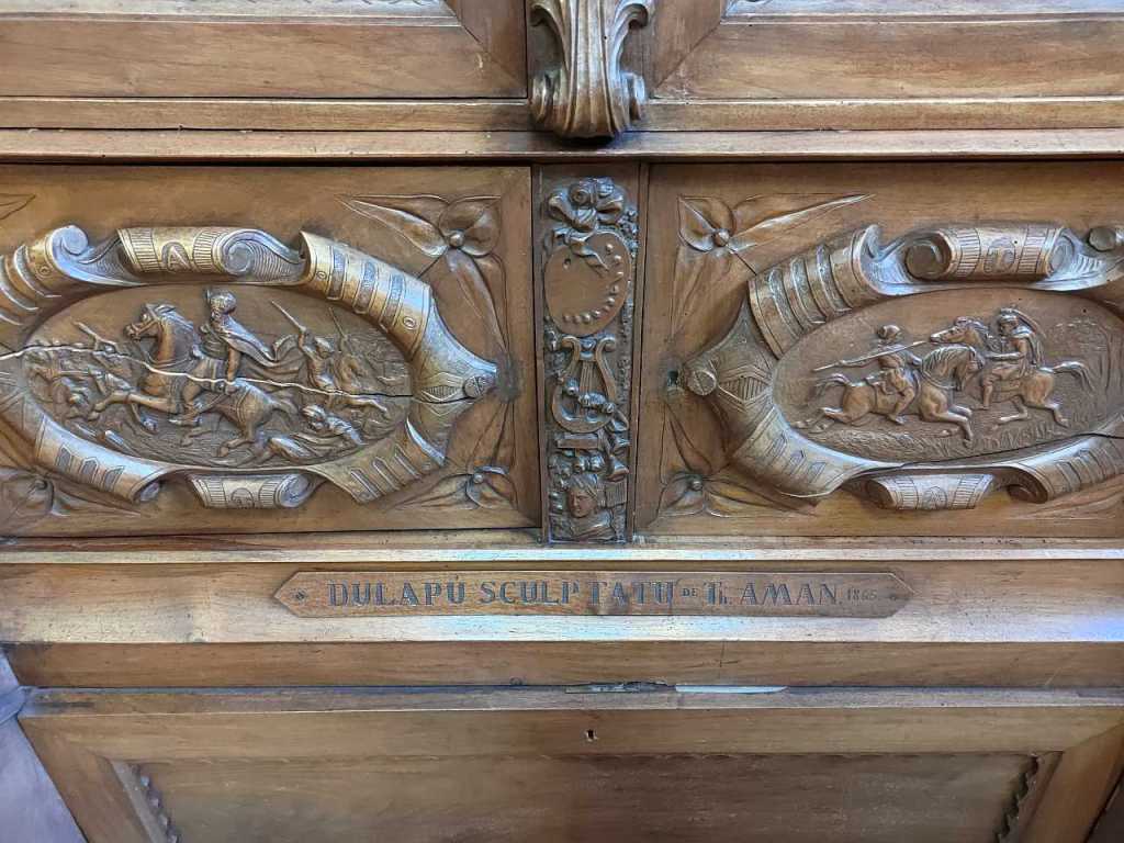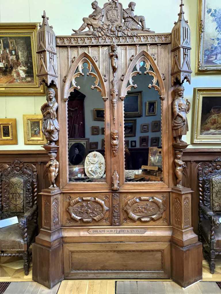 De asemenea, am admirat mobilierul sculptat de Theodor Aman, lucrat în stejar. Cum ar fi biroul pe care sunt reprezentate nouă chipuri de domnitori români din Țara Românească și Moldova, un dulap cu basoreliefuri ce reprezintă Pictura și Sculptura, altele cu nuduri de femei sau în care sunt reprezentați Eros și prințesa Psyche.