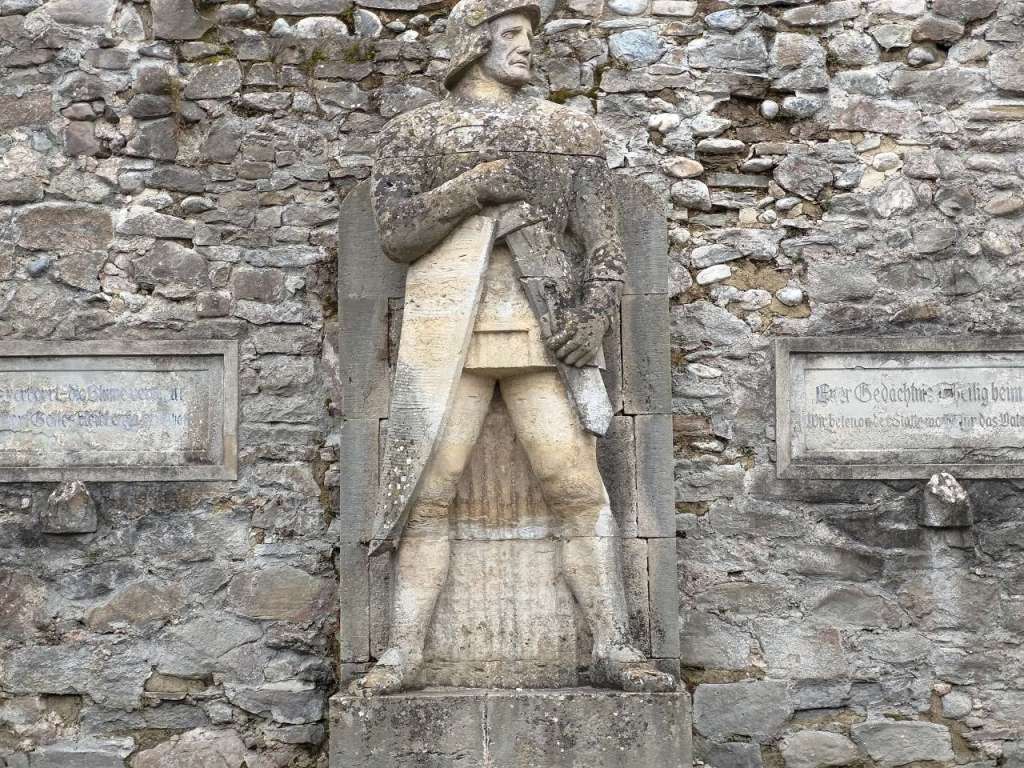 La interior am văzut un mic cimitir cu morminte ale soldaților germani căzuți în septembrie 1916 , vegheate de statuia lui Roland, vestitul paladin al lui Carol cel Mare.